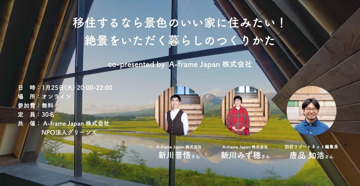 1/25(火)移住するなら景色のいい家に住みたい!絶景をいただく暮らしのつくりかた co-presented by A-frame Japan 株式会社を開催します。A-frameや絶景のある暮らしのつくりかた、今回の募集についてもご紹介するので、興味がある方はぜひご参加ください!