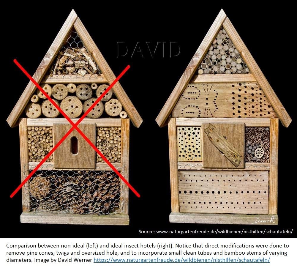 インセクトホテルの悪い例と良い例。左が穴が多すぎて寄生虫など他の害虫のすみかになってしまうことも。穴は小さく、数を増やすことがポイント via The Entomologist Lounge