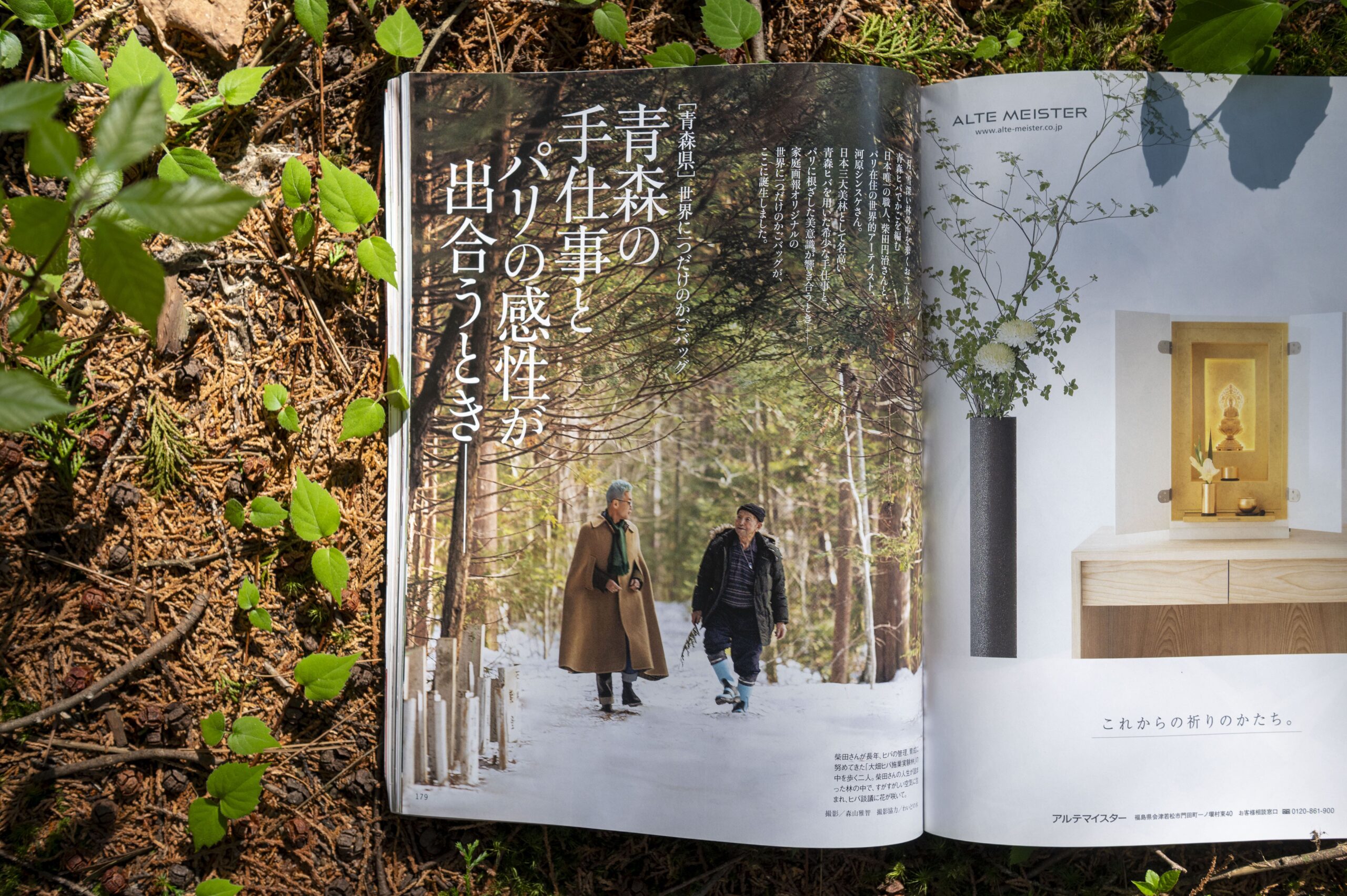 女性誌『家庭画報』には、柴田さんと、パリ在住のアーティストである河原シンスケさんが、実験林を歩いているシーンが写真に収まっている。この二人のコラボレーションによって、『家庭画報』オリジナルのかごバッグもつくられた(『家庭画報』2019年6月号より)