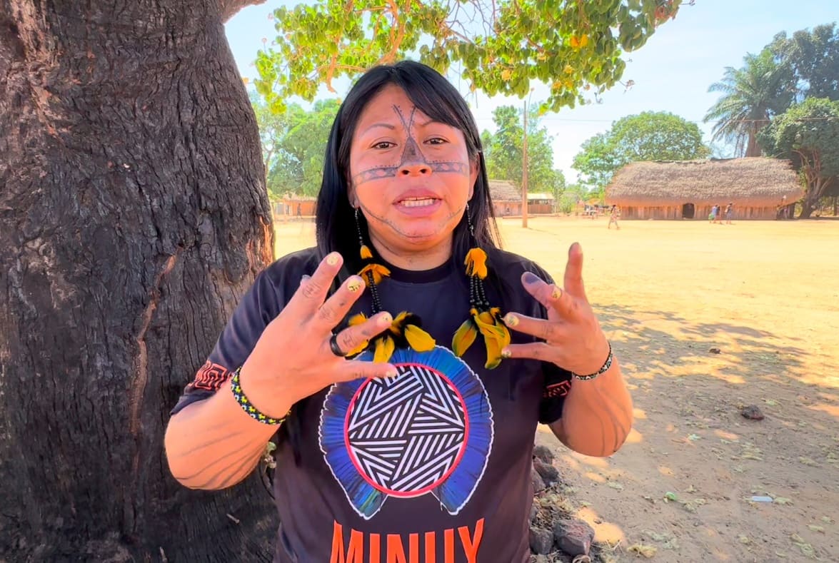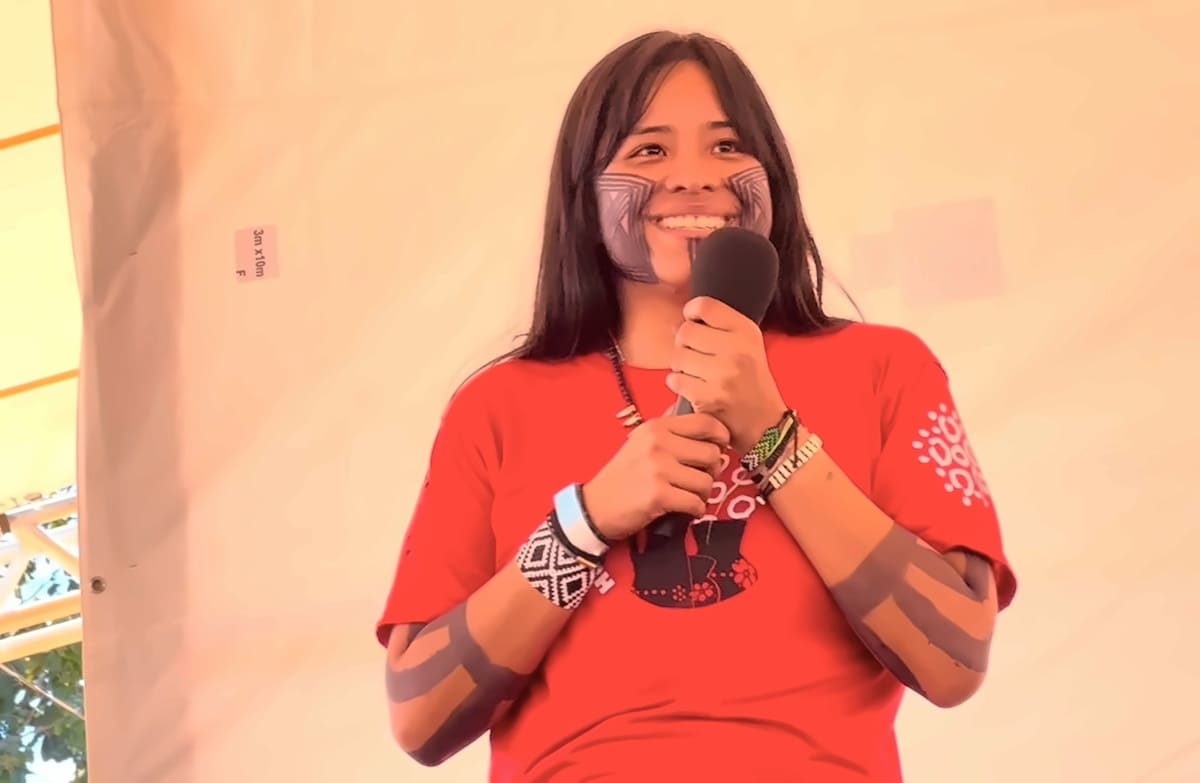 ムンドゥルク民族のリーダー、アレッサンドラ・コラップさん「金の違法採掘に使われる水銀によって、水俣病のようなひどい病気がアマゾンに広がり、私たち民族が被害を受けている。金を買う前に、金はどこから来て何をもたらすのか考えてほしい」(写真:下郷さとみ)