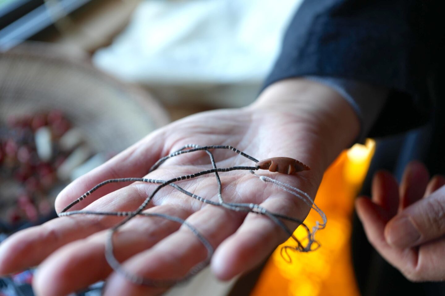 木の実の殻で作った極小ビーズをつなげた首飾り。金属がなかった時代は、硬い動物の骨を針のように尖らせたもので穴を開けていたとか。アルマジロのペンダントトップは別の種類の木の実で作られている。カヤビ民族の美しい手仕事だ