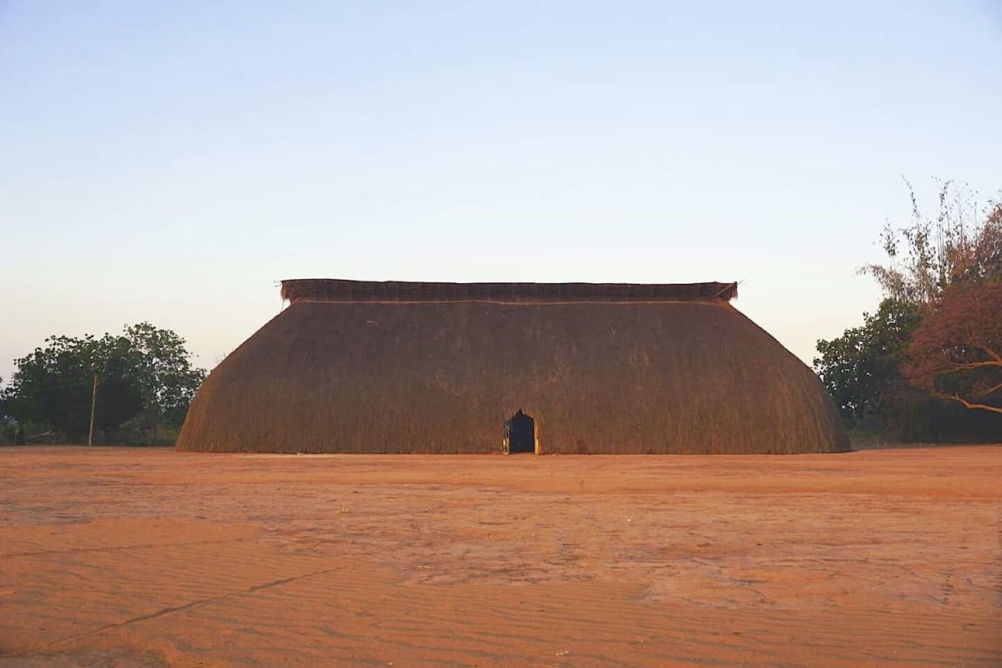 シンメトリーが美しい、シングー川上流域の村の大きな総茅葺(かやぶき)住居。茅の葺き替えは、村人総出で行われる。