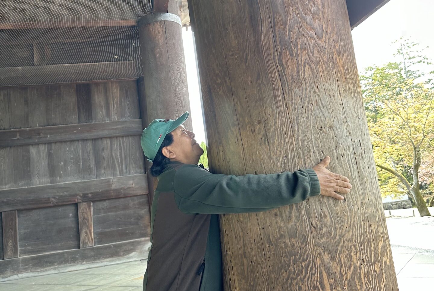 欧米とは違う日本の建物に興味津々のダビさん。「鉄が最小限しか使われていないね。ヤノマミの神話では地面の下にあるものを掘り起こしてはいけない。かつて偉大な精霊が悪いものを封じ込めたから。掘り出せば、それが世界に蔓延して病を引き起こし、森がなくなる」(写真:下郷さとみ)