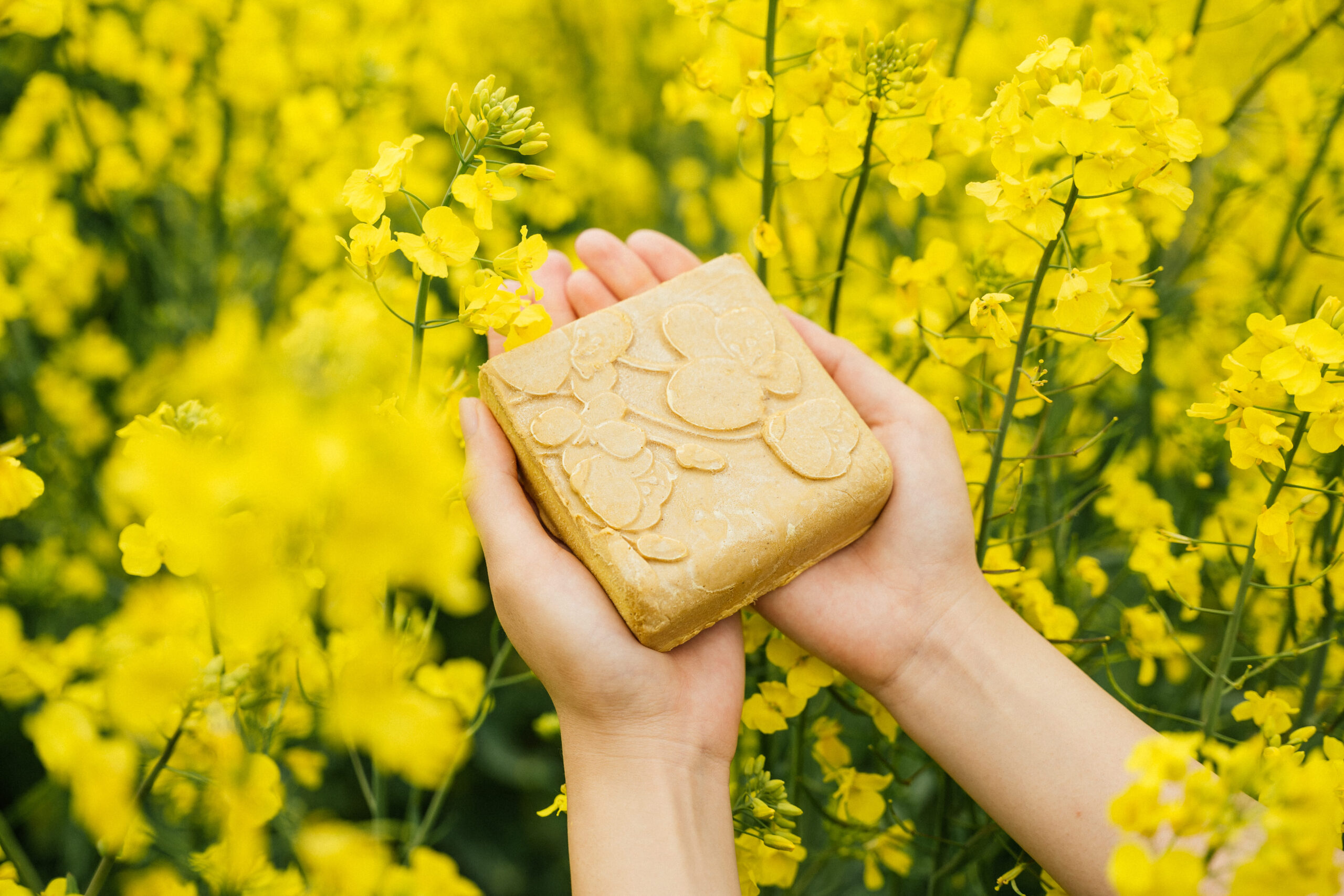 植物は放射性物質であるセシウムを土壌から吸収するけれど、油脂植物の種子から搾る油にはそれが移行しない。ウクライナのチョルノービリ(チェルノブイリ)原発事故の後に実証されていた科学的根拠のもと、安全性を確保できる新たな形で農業を再開していたのです。黒澤さんたちは、彼らがつくる菜種油を2015年からソープ、そして順次フェイシャルスクラブやシャワーオイルの原材料にも採用しています。