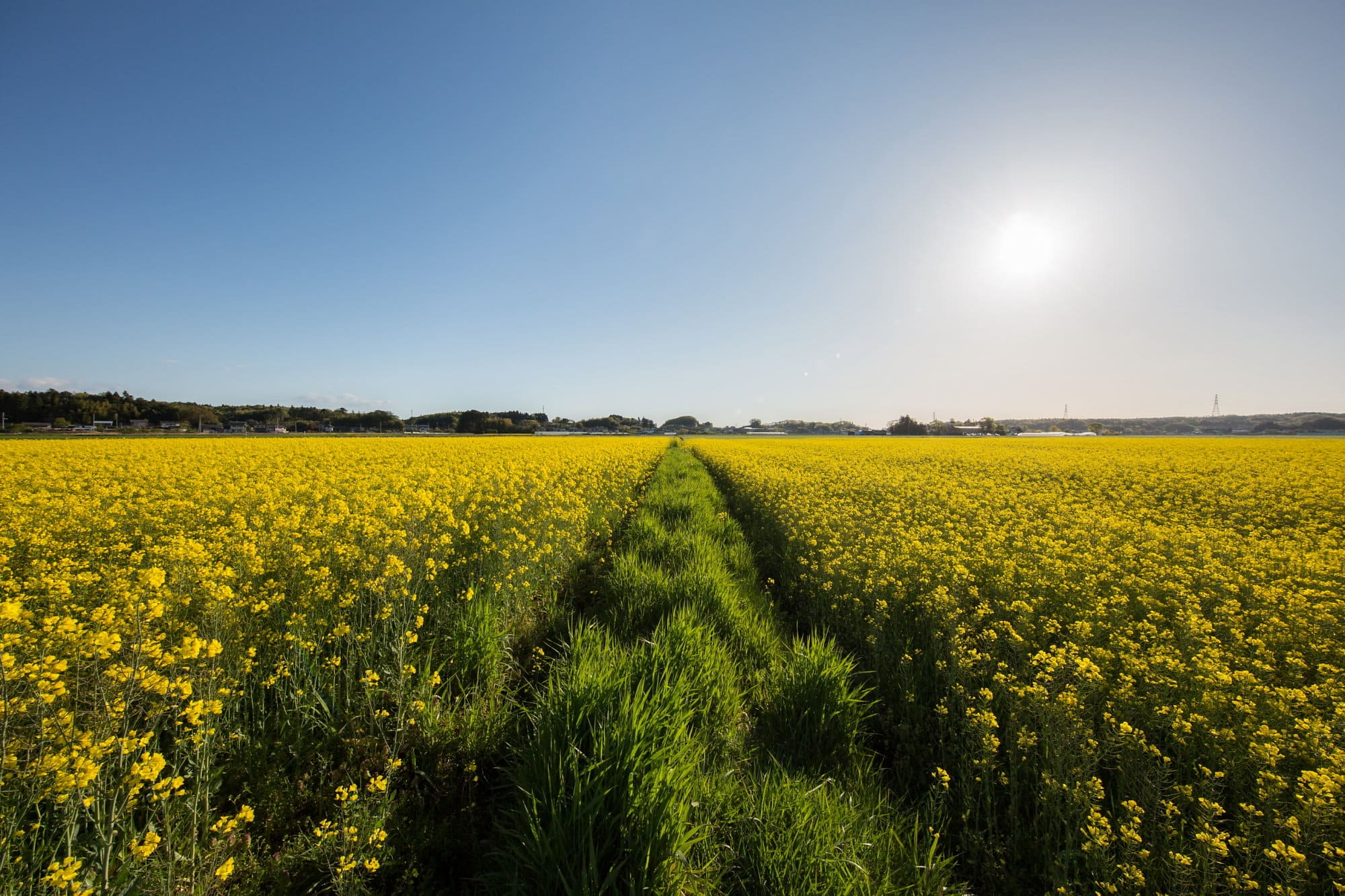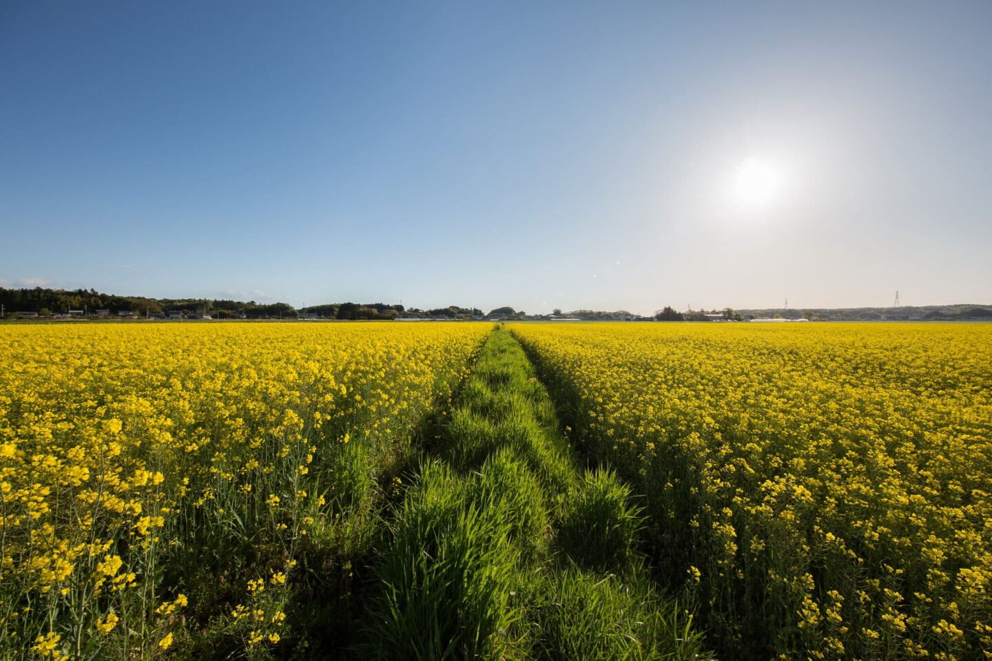 南相馬市の菜の花畑。こちらでは福島第一原発の事故の後、農地を再生する方法として油脂植物である菜種栽培を始めた。現在日本で消費される菜種油の原料は、99.9%が輸入に依存する中で、原料生産から加工まで一貫してピュアな菜種油を手づくりする(画像提供:ラッシュジャパン合同会社)