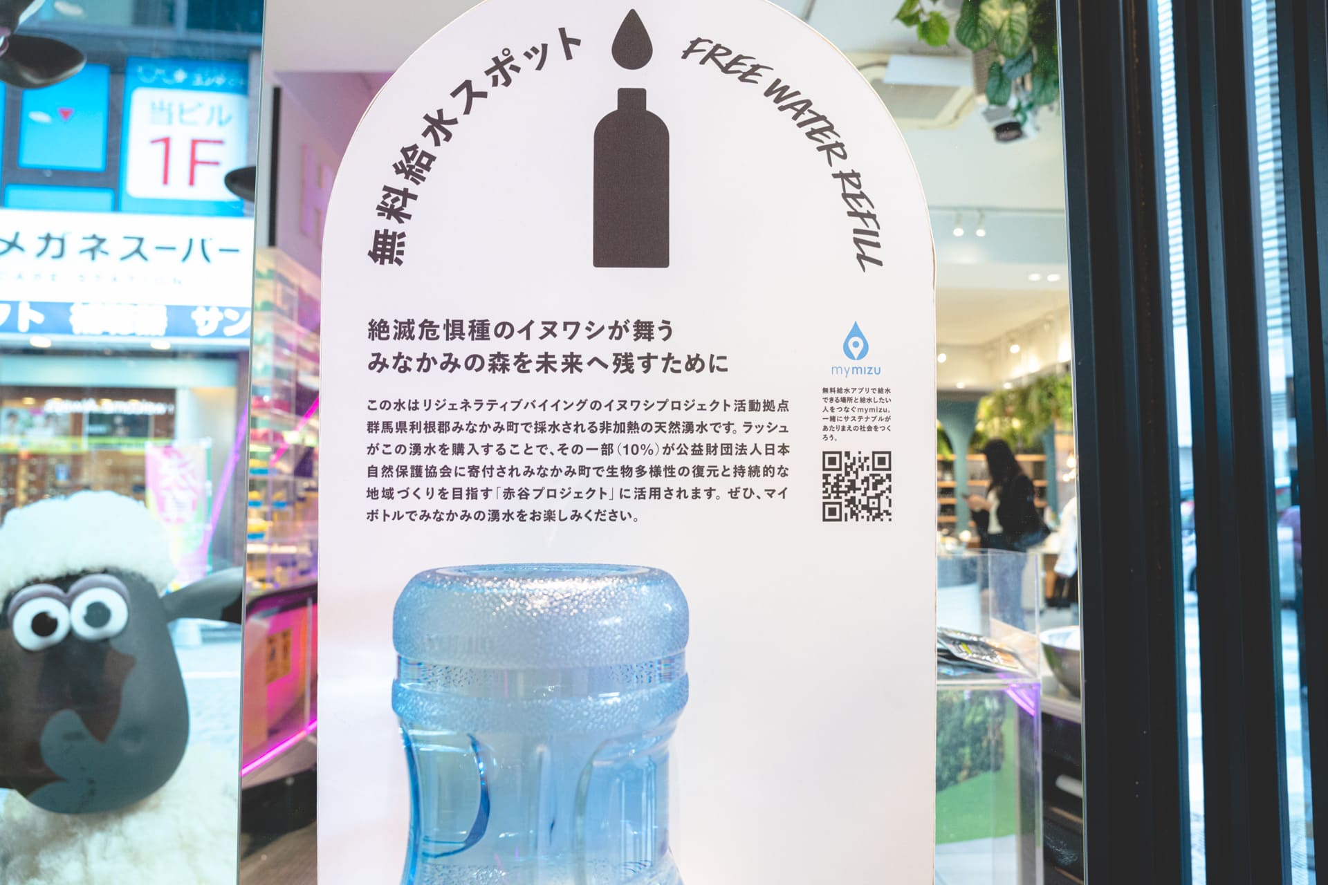 LUSH 新宿店の店舗内には、イヌワシプロジェクト活動拠点である群馬県利根郡みなかみ町で採水される非加熱の天然湧水の給水機を設置。この湧水を購入すると、売上の10%が公益財団法人日本自然保護協会に寄付される