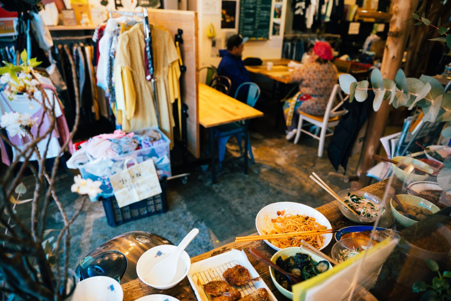 その向かい側には、ラックいっぱいに色とりどりの古着や、お土産などが販売されています。古着を手に取って見る人もいれば、お隣のテーブルでランチを囲んで談笑する人の姿も。一番奥にはフローリングの小上がりがあり、アップライトのピアノやテーブル、椅子が並びます。