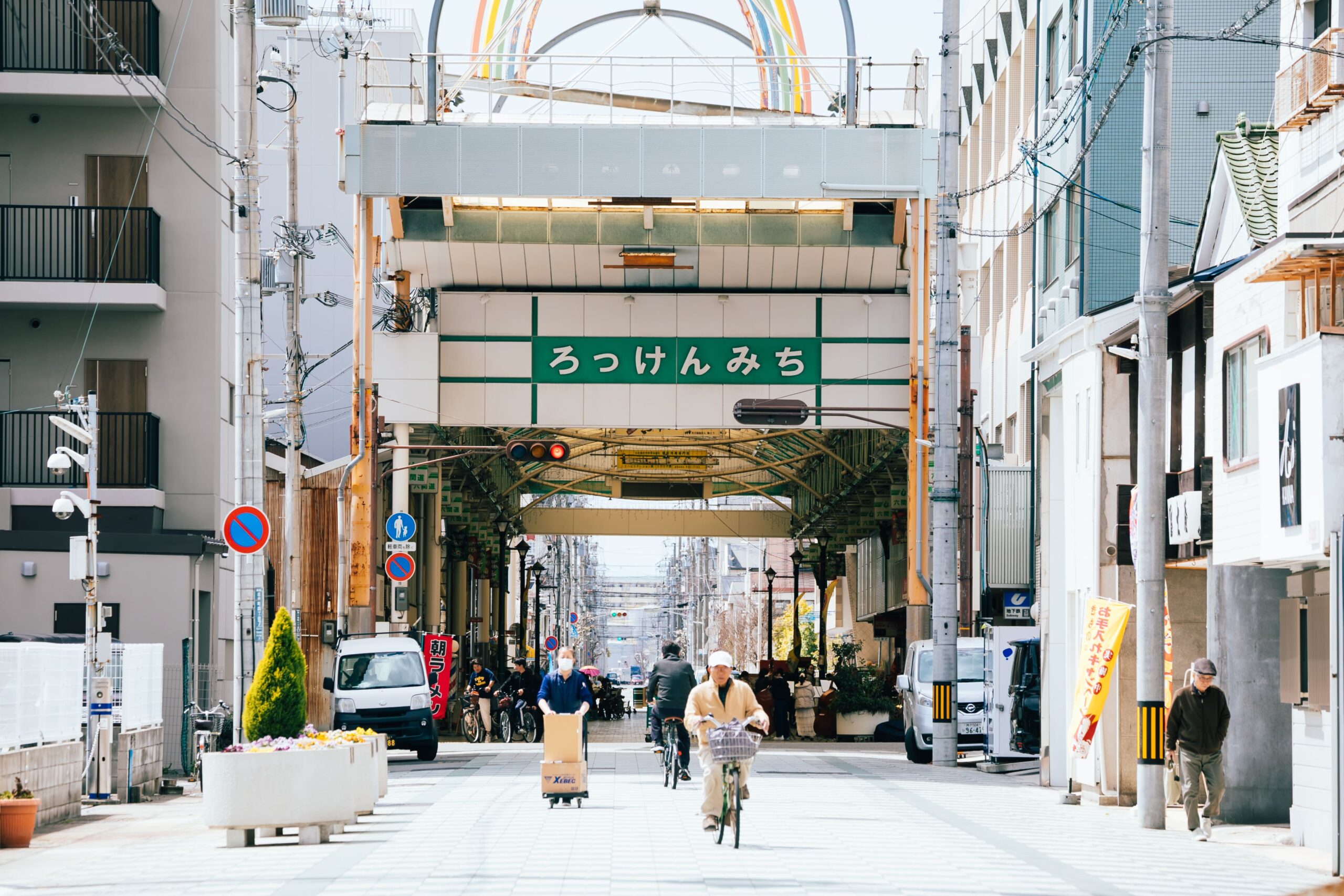 JR新長田駅から徒歩10分ほどのところにある六間道商店街は、神戸の下町として有名なエリアです。大正〜昭和にかけて、海沿いの重工業地帯に近かったことからも発展し、かつては多くの人が往来していたそう。しかし、阪神・淡路大震災で大きな被害を受け、人口流出が進むとともに商店街には空き店舗も増えていきました。