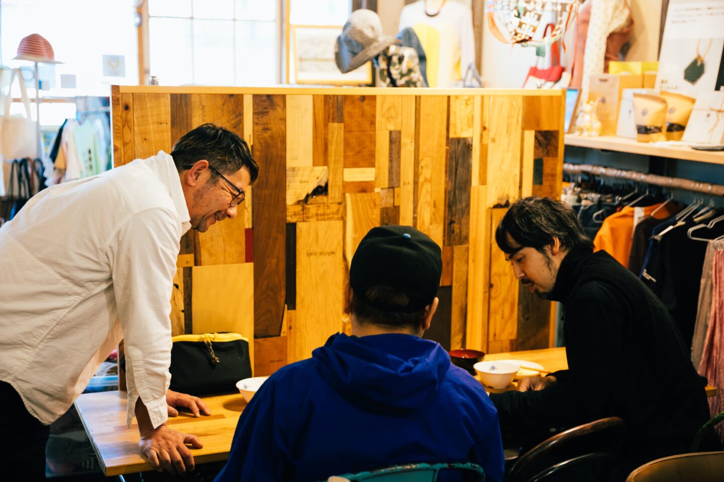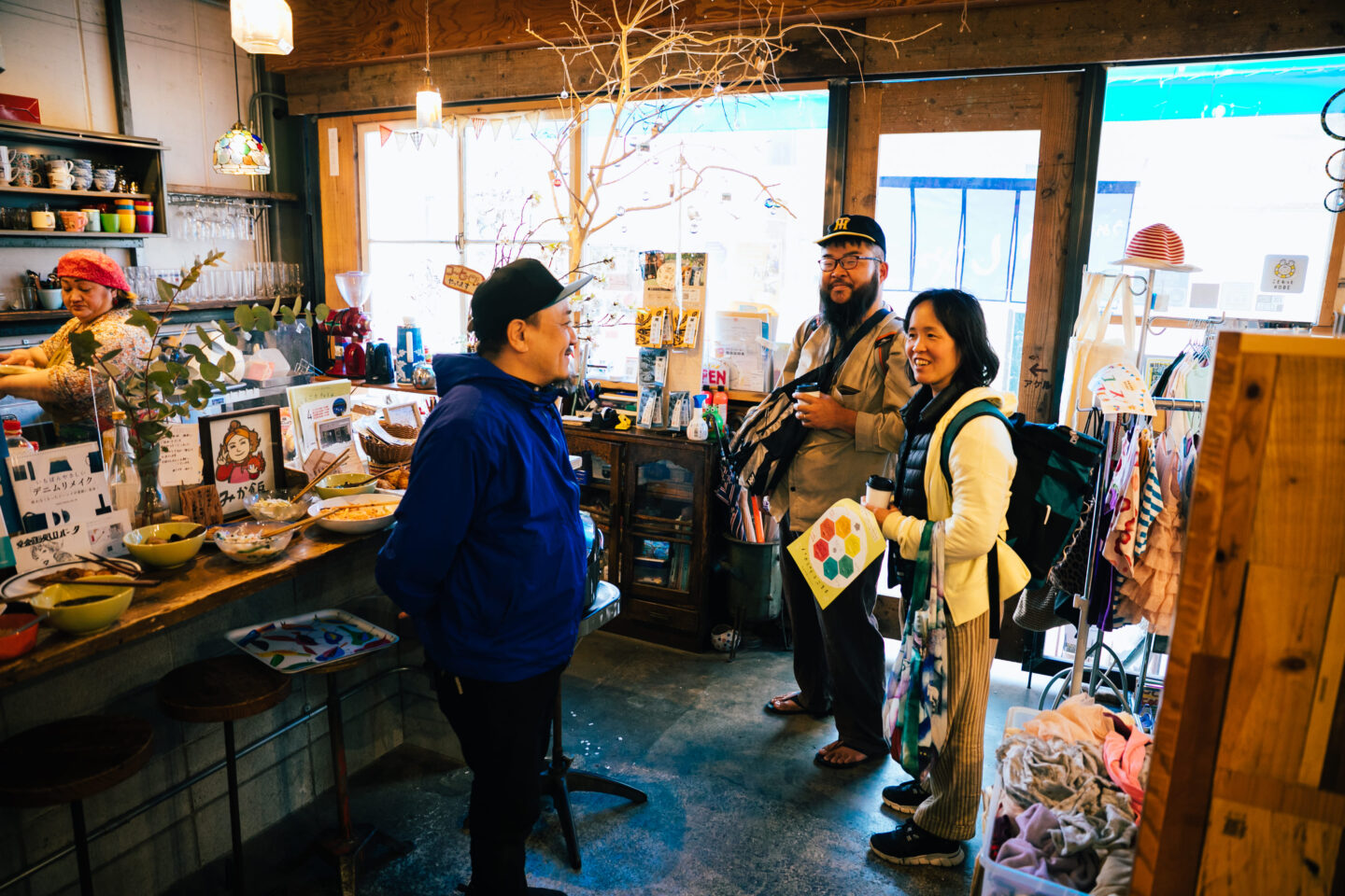 インタビュー中には、初めてロッケンを訪れた方に、みかさんやフッチーさんが声をかけて紹介する様子や、急な雨に気づいたカフェのお客さんが、外の縁着(古着)ラックを中にいれる姿が。2人が開いてきた場は今、みんなでつくる場になっています。