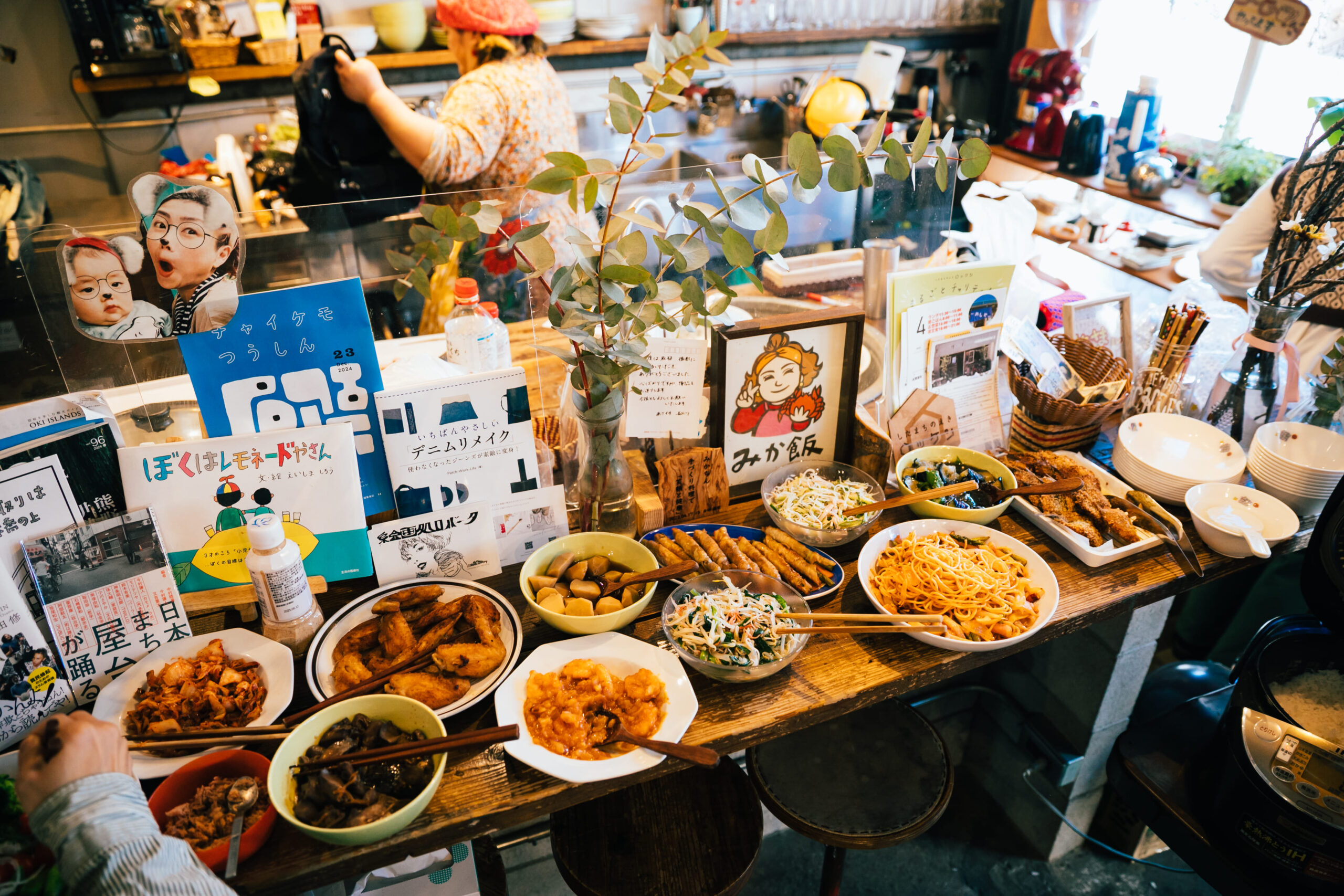 入ってすぐのキッチンカウンターに並ぶのは、できたてのお惣菜。この日の日替わり店主さんが、ビュッフェ形式のランチを提供していました。どんどん品数が増えていき、美味しそうなにおいが広がります。