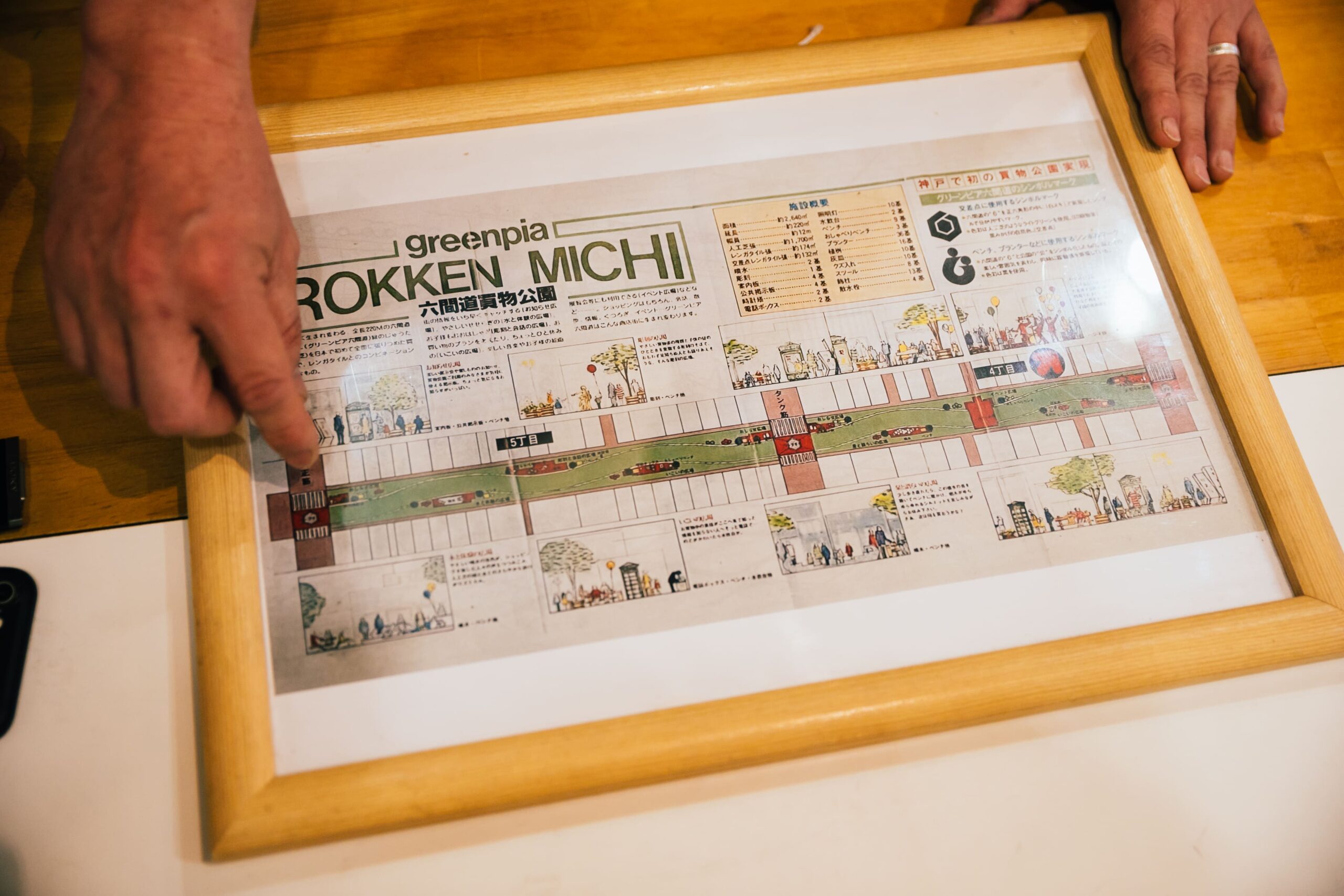昌宏さん 僕たちも、偶然この絵を見せてもらって知ったのですが、昭和50年代この商店街に人工芝を敷き、ベンチやプランターを設置して、商店街を公園化する「グリーンピア六間道」という取り組みをしていたそうです。決してぼくたちが新しいことをしているのではなく、まちにはそんな歴史があって。ロゴマークにはそのとき使われていたシンボルマークを継承しました。