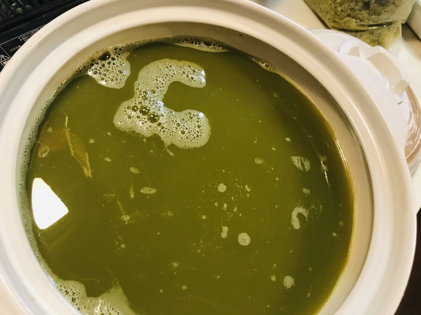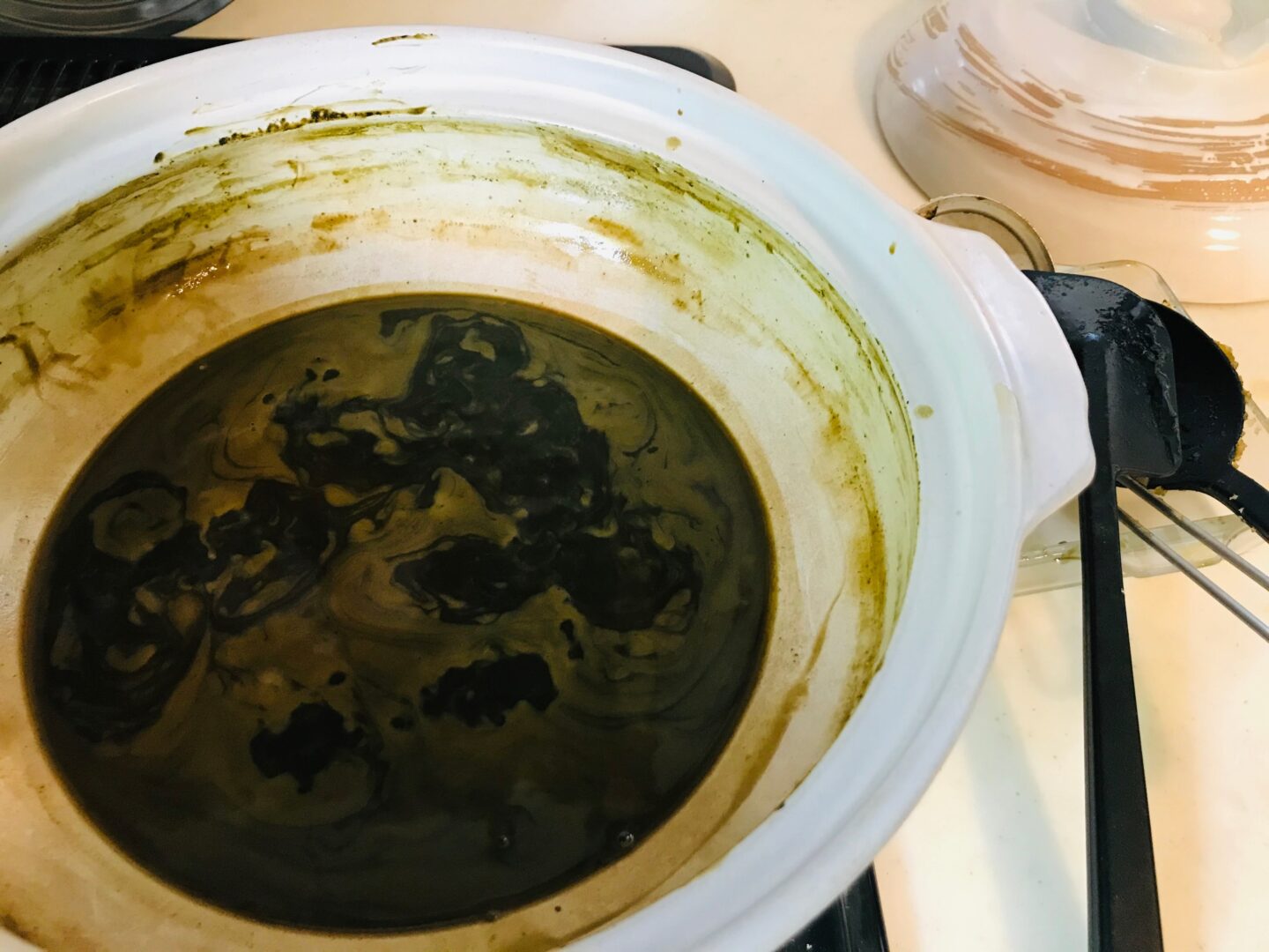 工程2の果汁を、弱火でひたすら煮詰めます。目指すゴールは、色が緑から黒っぽくなり、ゴムベラの跡が鍋底につくくらい。飴状まではいかない、軽い粘度があるくらいが目安です。