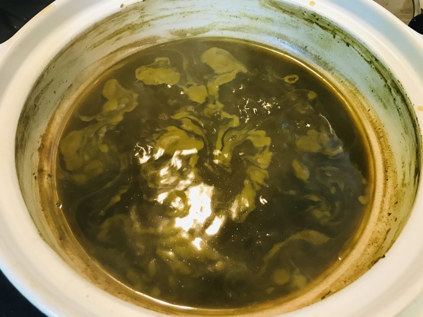 完成。土鍋は余熱があるので、容器に移してから冷ます。7キロの梅から200gほどの梅肉エキスになりました。ちなみに鍋肌に残った梅肉エキスは水で薄めて冷蔵保存すれば無駄がありません。薄めても酸っぱいので、同じ時期につくれるミントシロップなど甘味と合わせると飲みやすくなります