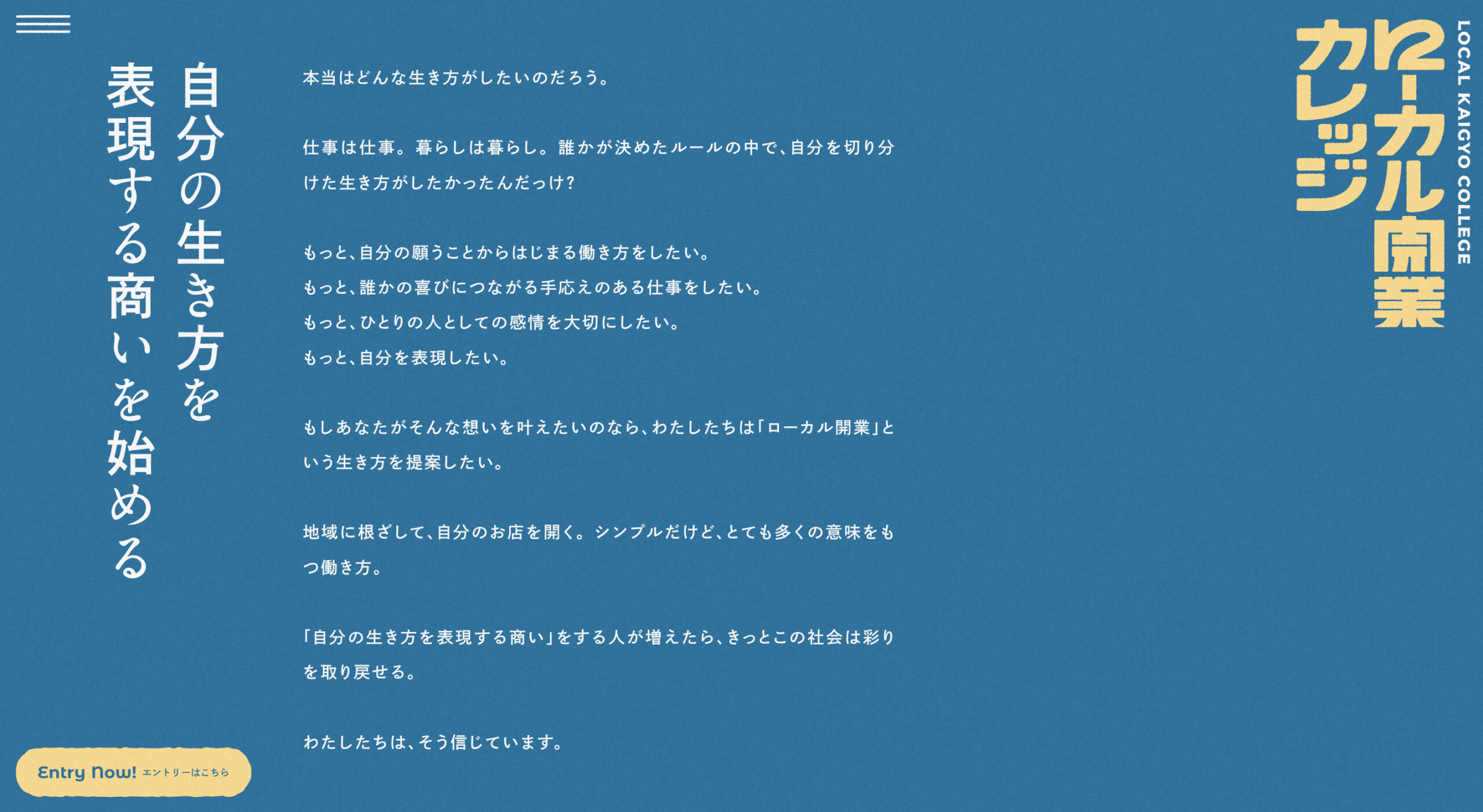 自分の生き方と向き合い、胸の奥で眠っていた「本当はやりたかったこと」の芽を伸ばせるのが、「ローカル開業カレッジ」です。すぐに開業や移住するつもりがなくても大丈夫。まずはウェブサイトをのぞいてみてくださいね。