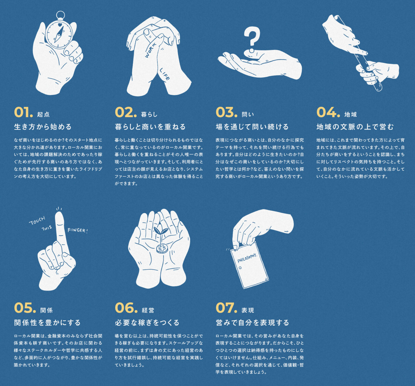 長田さん はい、まず一番大きいところで言うと、「ローカル開業7ヶ条」をつくったことですね。第一期から「ローカル開業=自分の生き方を表現する商い」という定義ではやってきましたが、ローカル開業とそうでない開業の違いについて、具体的に整理できていなかったんです。