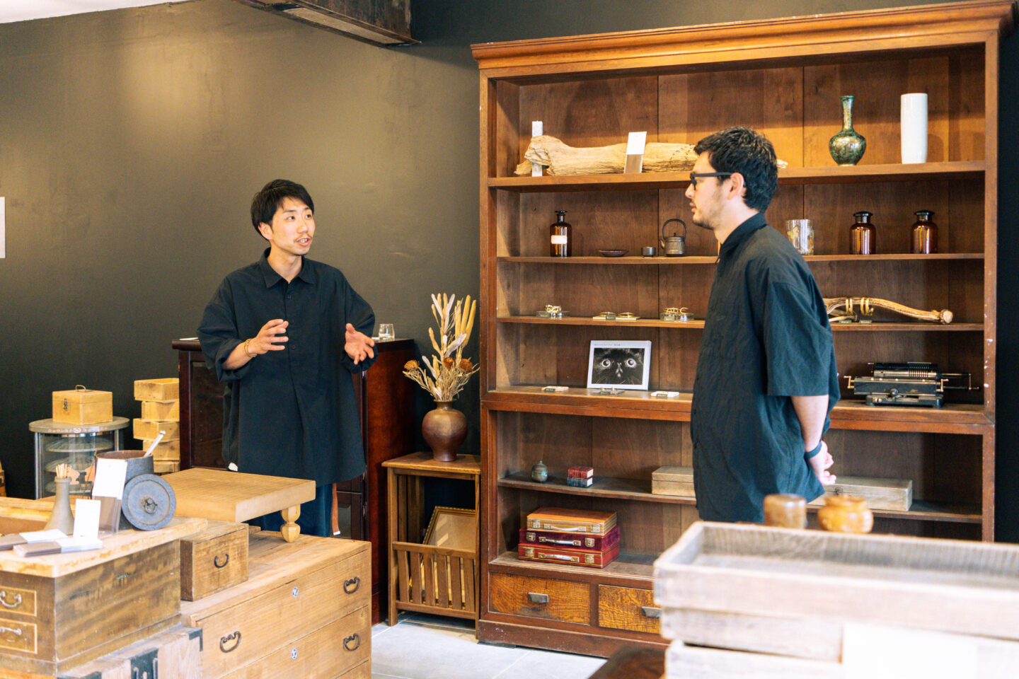 絹張さんの案内で、「ANSHINDO」の隣にオープンしたばかり(取材当時)の古家具屋「積分堂」へ。店内の壁塗りや家具の搬入など、「オープンにあたり、まちの人にたくさん協力してもらいました」と店主のタサキアツヤさんが教えてくれた。
