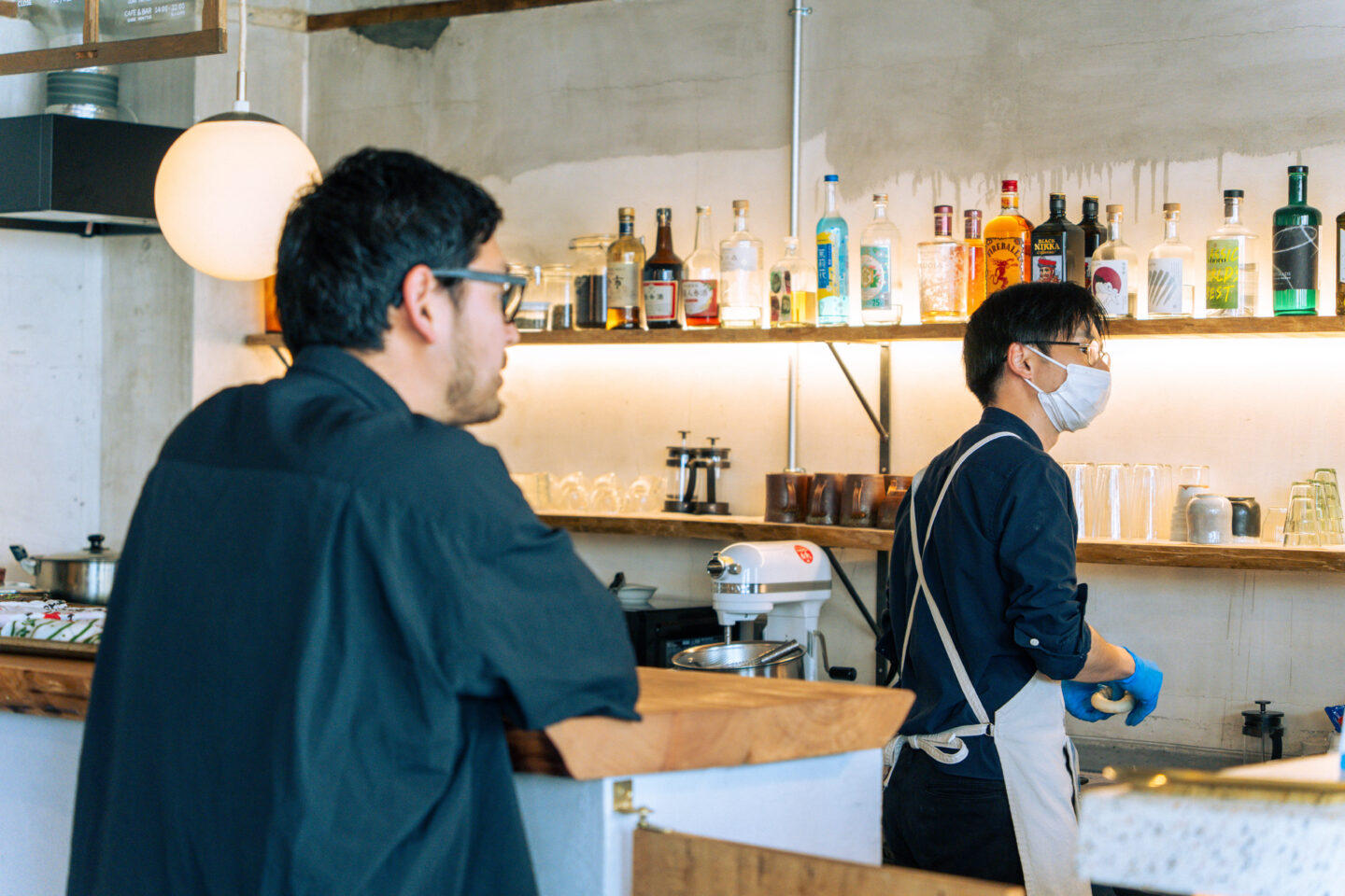 「ANSHINDO」の1階にあるベーグルカフェ「hibi」のカウンターにて。店主の淀大祐さんは、絹張さんが札幌のゲストハウスで働いていたときのお客さんだったのだそう。「『上川に来ちゃいなよ!』って言ったら、本当に来ちゃったんですよ」と絹張さん。