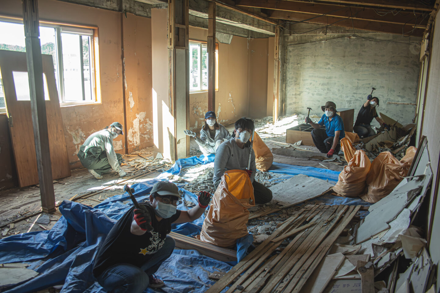 解体作業の様子。グランドオープンの1 年前、2023年6月に「ANSHINDO プロジェクト」を立ち上げ、町内外の人の協力を募り、解体・施工作業をプロの手を借りながら自分たちで行った。