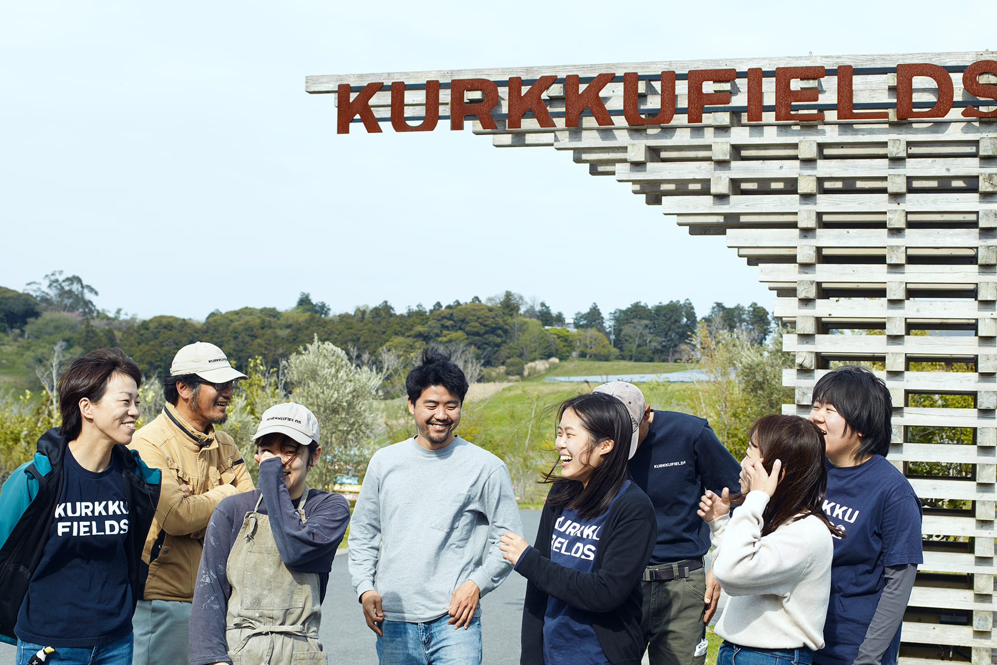 東京駅の人混みをぬって、木更津方面の高速バスに滑り込むように乗って1時間半。バスを降りてゆるい坂を登っていると、「もうすぐだよ!」と励ましてくれるような、「KURKKU FIELDS」というポップな表示が。さっきまでグレーの街並みにいたことを忘れてしまうような緑に心が潤います。