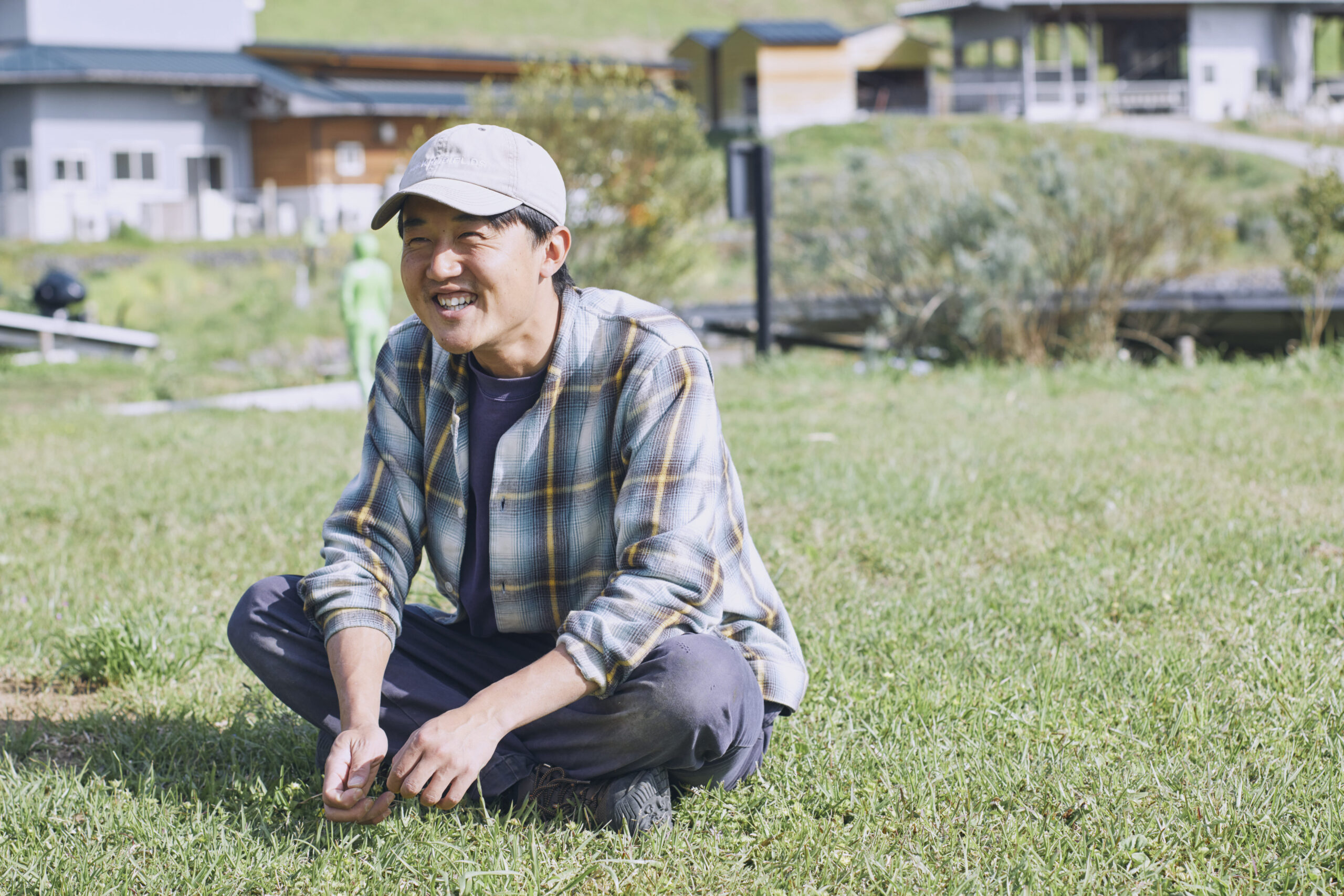 ほどなくして、KURKKU FIELDS(以下、クルックフィールズ)に到着。ゲートをくぐった先には、公園のようでもあり、農村のようでもある、ほっとする美しさの風景が広がっています。深呼吸をしながらキョロキョロしていると、「ようこそ!」と元気な声。振り向いた先で手を振っているのは、クルックフィールズの新井洸真(あらい・こうま)さん。