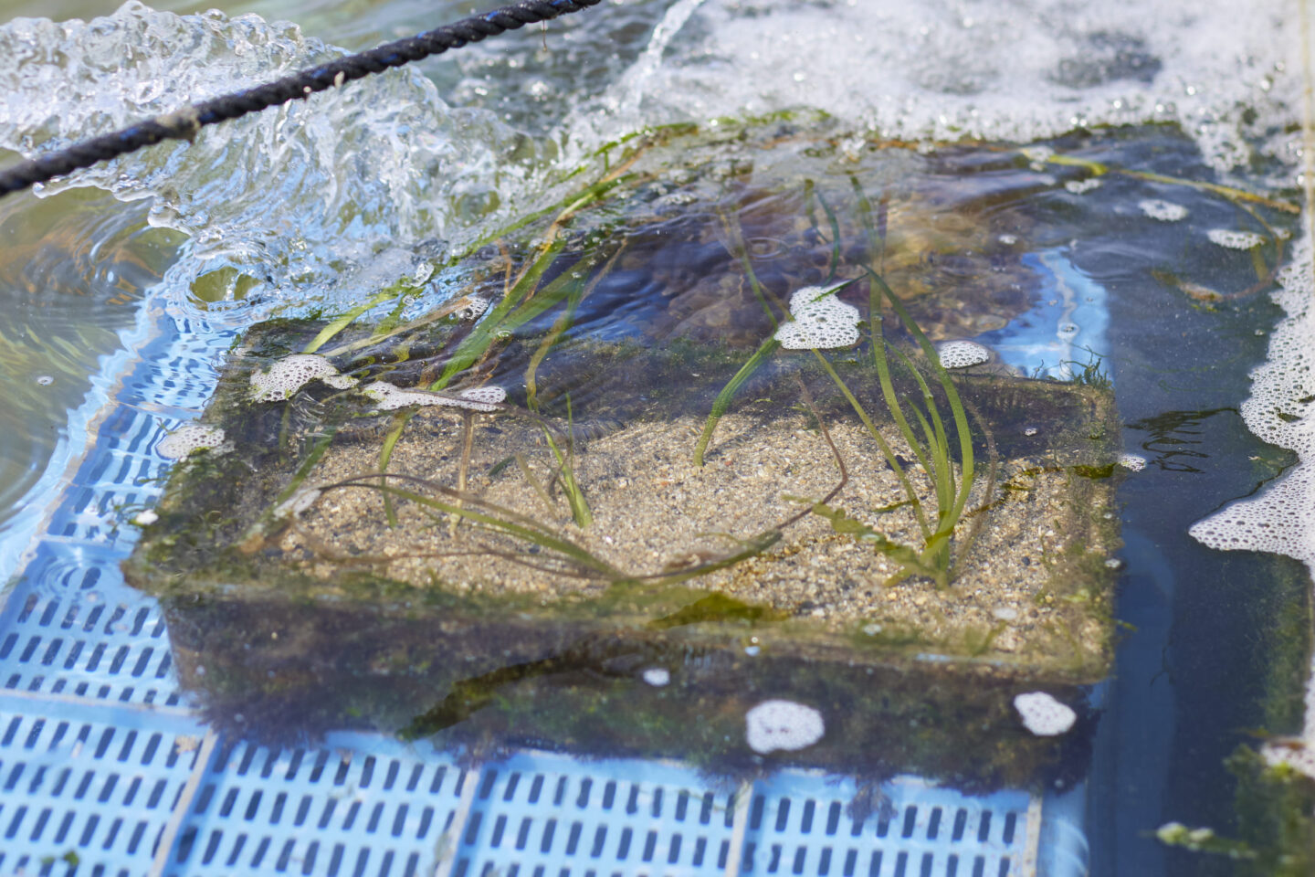 近隣のアマモ群落から採取した株を育て移植する「栄養株移植法」という手法で、岩井さんが陸上の水槽で育てているアマモの株