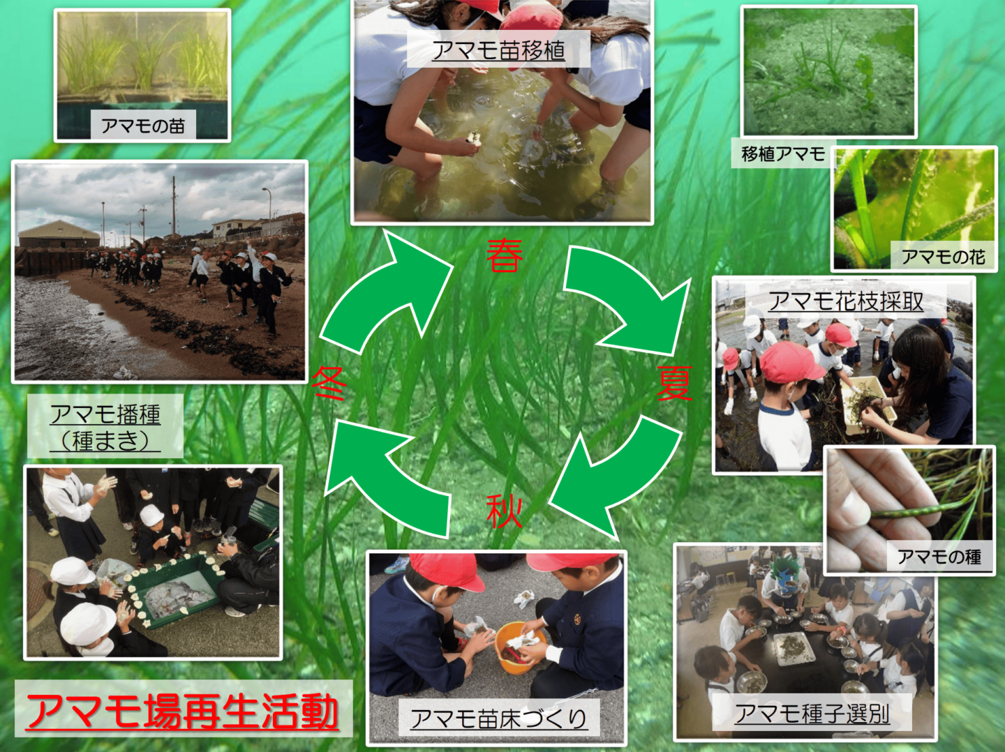 2008年からは、総合学習として小学生とともにアマモの藻場(アマモ場)の再生にも取り組んでいます。