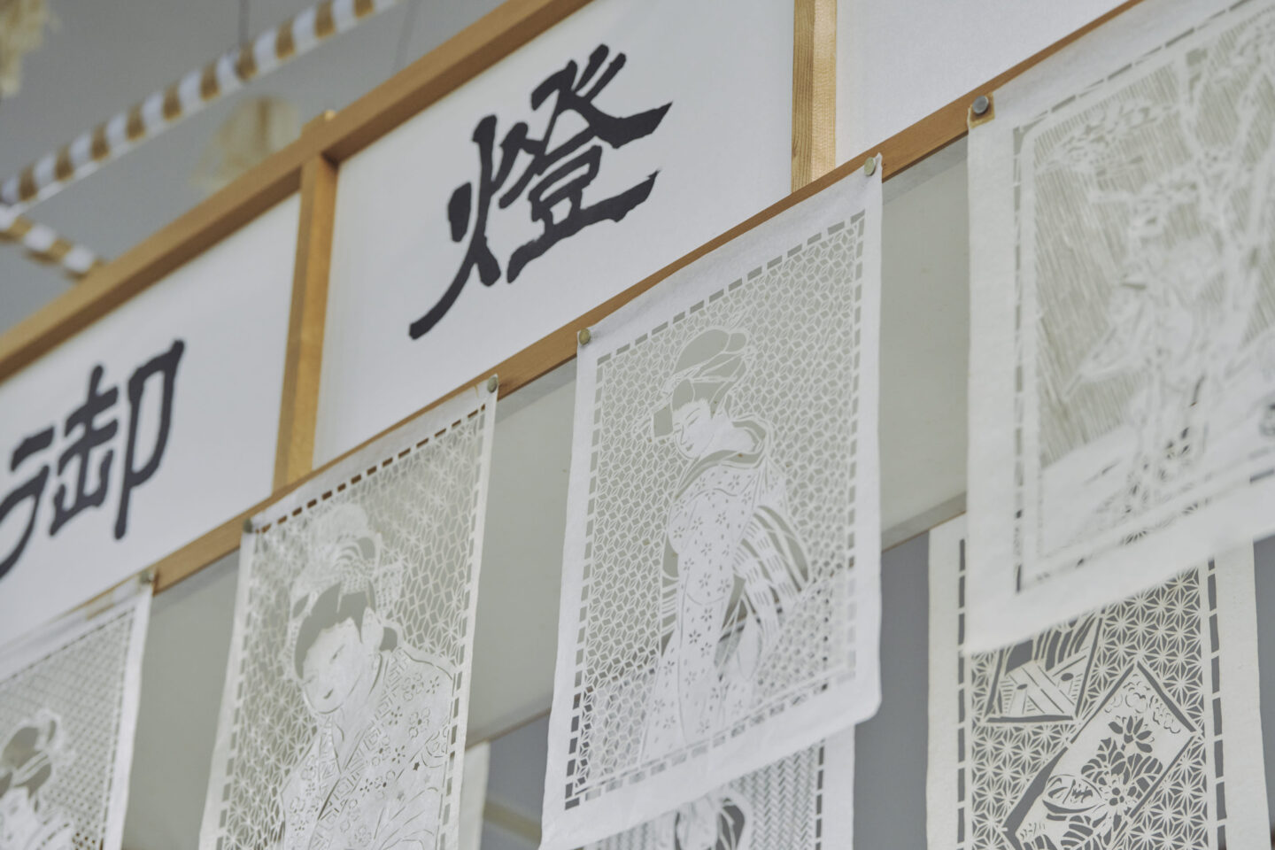 大宮踊の輪の中心にある灯籠に飾り付ける、切り絵細工の「シリゲ」。かつては冬からつくり始められたそう。現在は、小学校の授業で子どもたちがシリゲ製作に取り組むことも。取材の日は、ちょうど大宮踊りの練習開始日だった