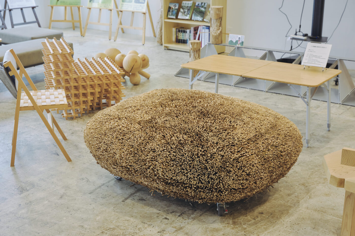例えば、蒜山の自然共生に関する行為やものを紹介する「GREENable HIRUZEN」のサイクリングセンターには、軒裏や天井、壁などの内装に至るまで茅がふんだんに使われています。下から見上げた時に断面が見えるこの葺き方は、珍しい工法だそう。また、今回のアクションツーリズムの拠点にもなる「シェアオフィス蒜山ひととき」に置かれているのは、茅葺の椅子。建築の内装や家具への活用など、既存の方法にとらわれないアイデアで挑戦しています。