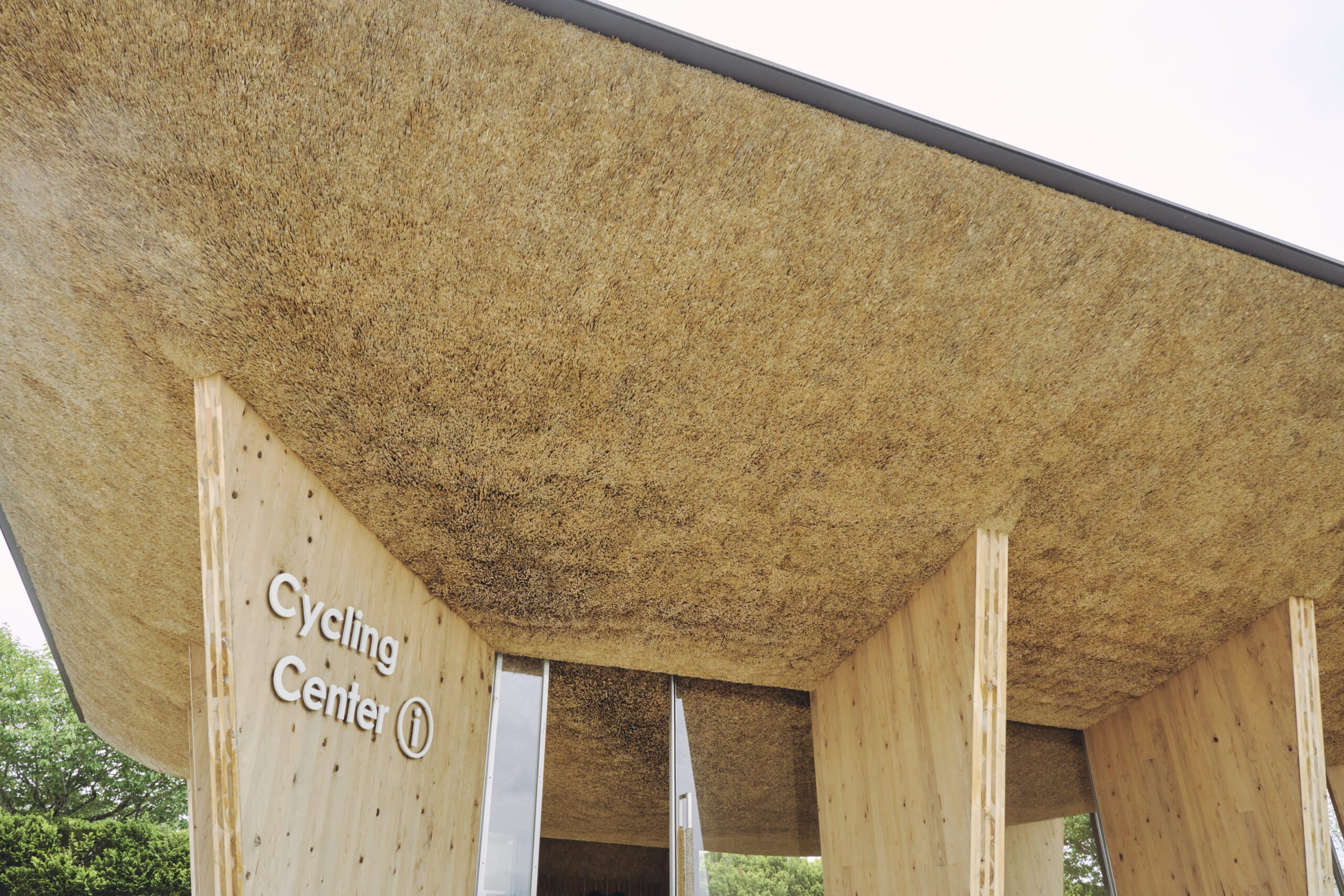 GREENable HIRUZEN(グリーナブルヒルゼン)のサイクリングセンター。室内の天井や受付カウンターなどにも、茅が使われている
