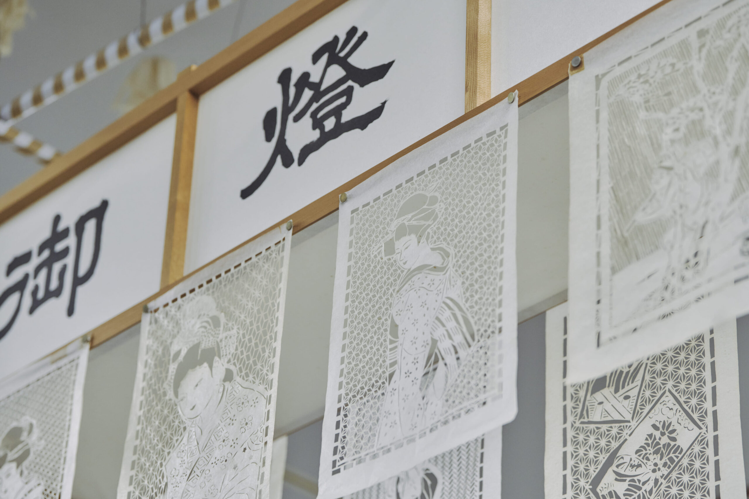 大宮踊の輪の中心にある灯籠に飾り付ける、切り絵細工の「シリゲ」。かつては冬からつくり始められたそう。現在は、小学校の授業で子どもたちがシリゲ製作に取り組むことも。取材の日は、ちょうど大宮踊りの練習開始日だった