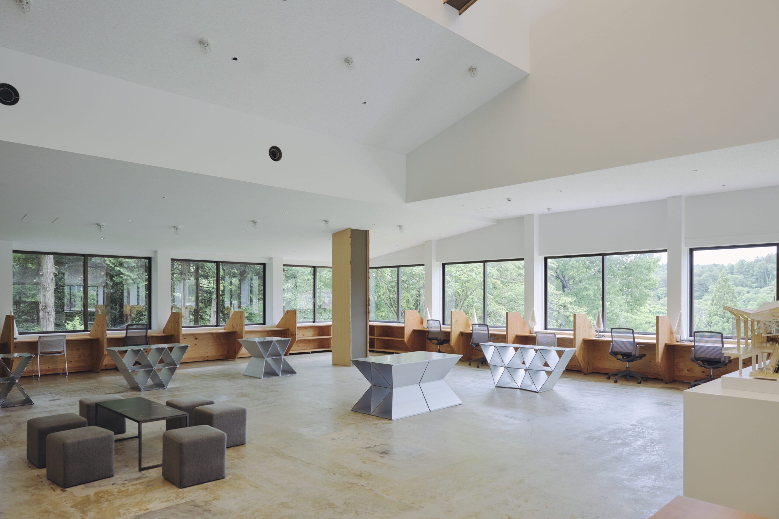 今回みなさんにお話を伺った「シェアオフィス蒜山ひととき(以下、ひととき)」は、大山隠岐国立公園内の旧レストハウスを建築家・隈研吾氏率いる設計事務所がリノベーションし、2023年にオープンした真庭市の施設です。「ひととき」の設計時は、まだコロナ禍の真只中。隈氏が提唱したのは「ハコからの解放」という概念でした。