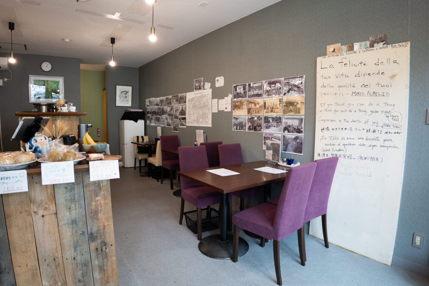 店の壁一面にまちの歴史が貼られている