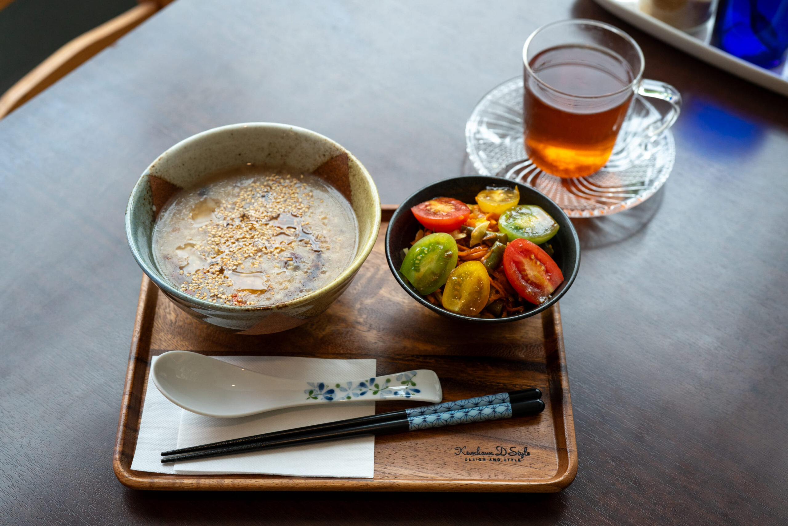 滋養強壮、体の芯から元気になる薬膳がゆセット1,100円。素材の旨みが凝縮されて体の芯まで温まる。地元農家の新鮮野菜を使ったサラダは、シャキシャキ食感で食べ応えも抜群