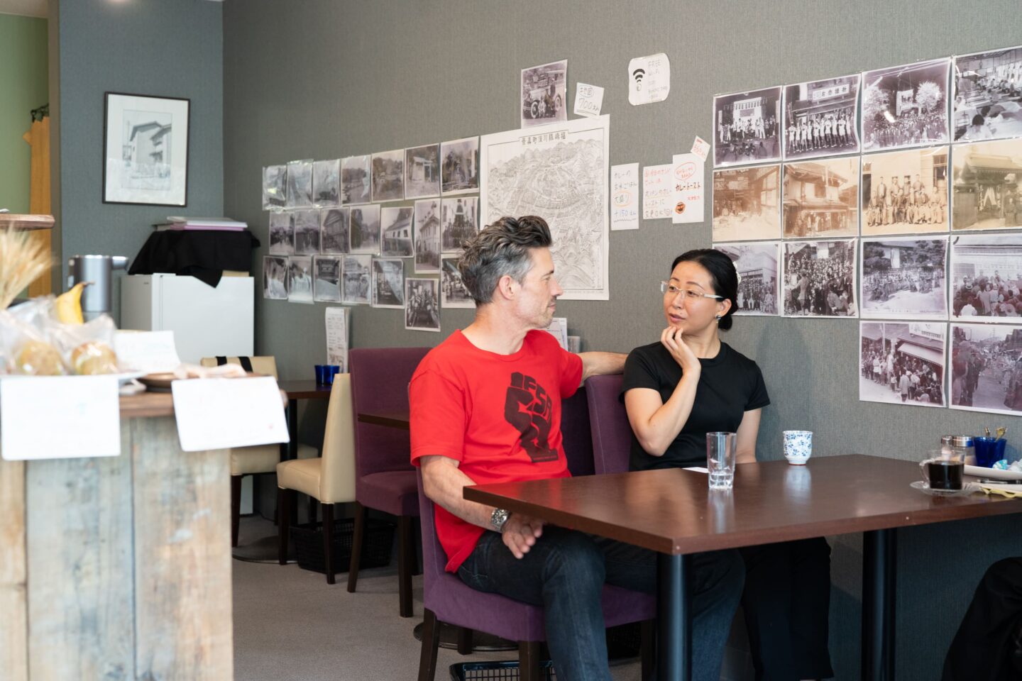 店舗をつくり上げるうえでふたりが何より大切にしたのは、この町へのリスペクト。店の壁一面には、川俣町が絹織物の産業でにぎわっていた時代の写真や、大正時代に描かれた町の地図も飾りました。