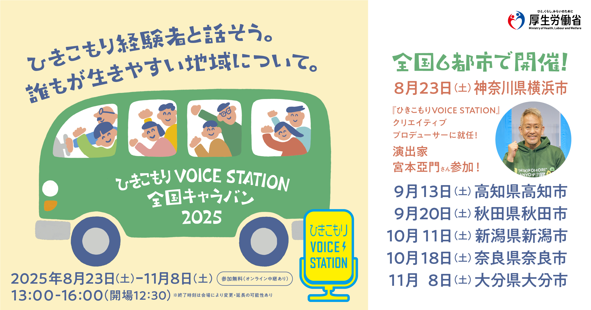 2025年度は、神奈川、高知、秋田、新潟、奈良、大分の6都市でキャラバンを行います。今年度はクリエイティブプロデューサーに、演出家の宮本亞門さんが就任。キャラバンのプログラムには、自らもひきこもり経験者である亞門さんのアイデアが盛り込まれています。