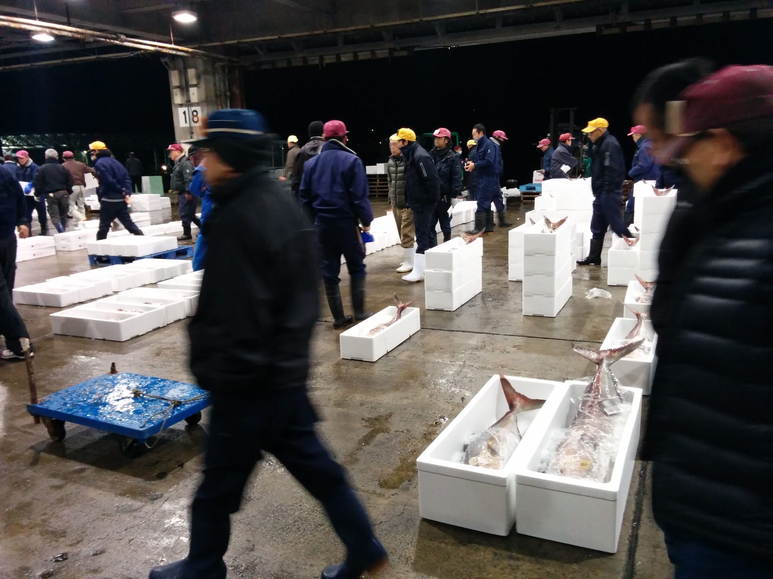 今では毎朝、全国約100の漁港から出品があり、そこに約500店舗のスーパーが参加するかたちで、活気あふれる取引が行われています。