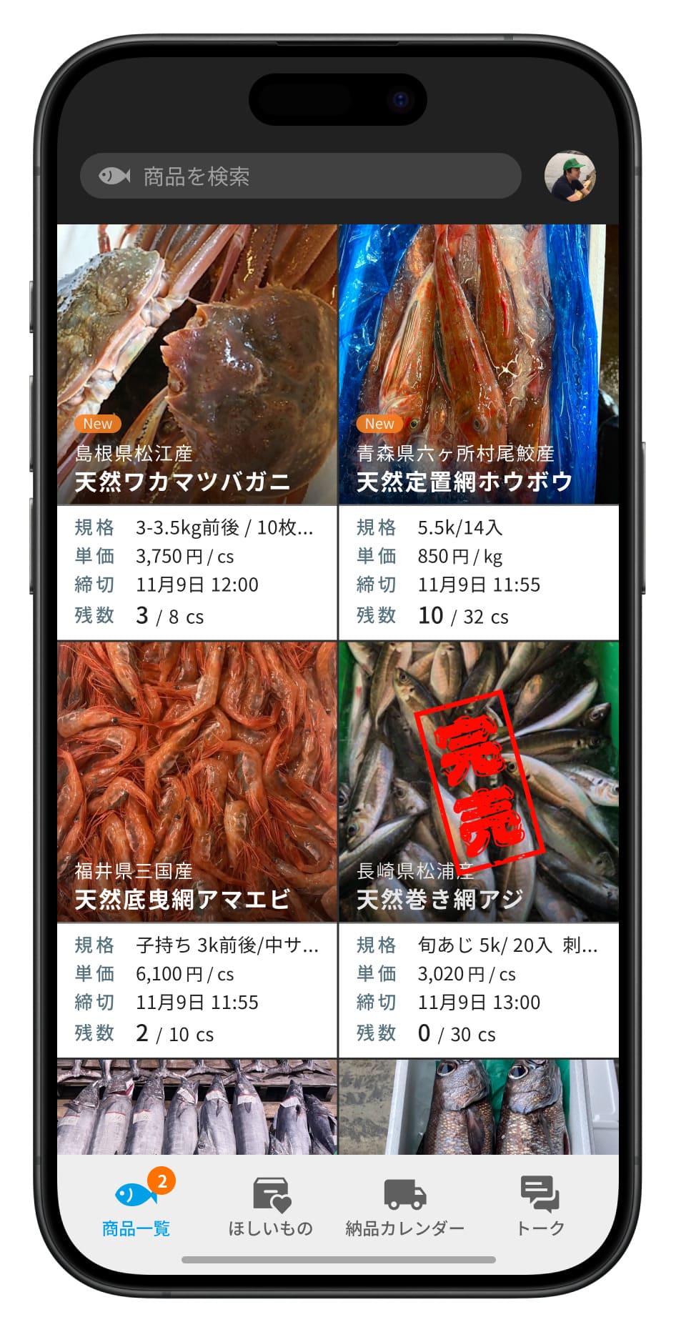 売買はリアルタイムで進み、珍しい魚や地域特有の野菜なども含めて、出品から10分もしないうちに次々に注文が入るとのこと。東京の豊洲市場や大阪市中央市場に代表される全国の消費地市場(※)が、活気もそのままにスマートフォンのなかで再現されたようなプラットフォームです。