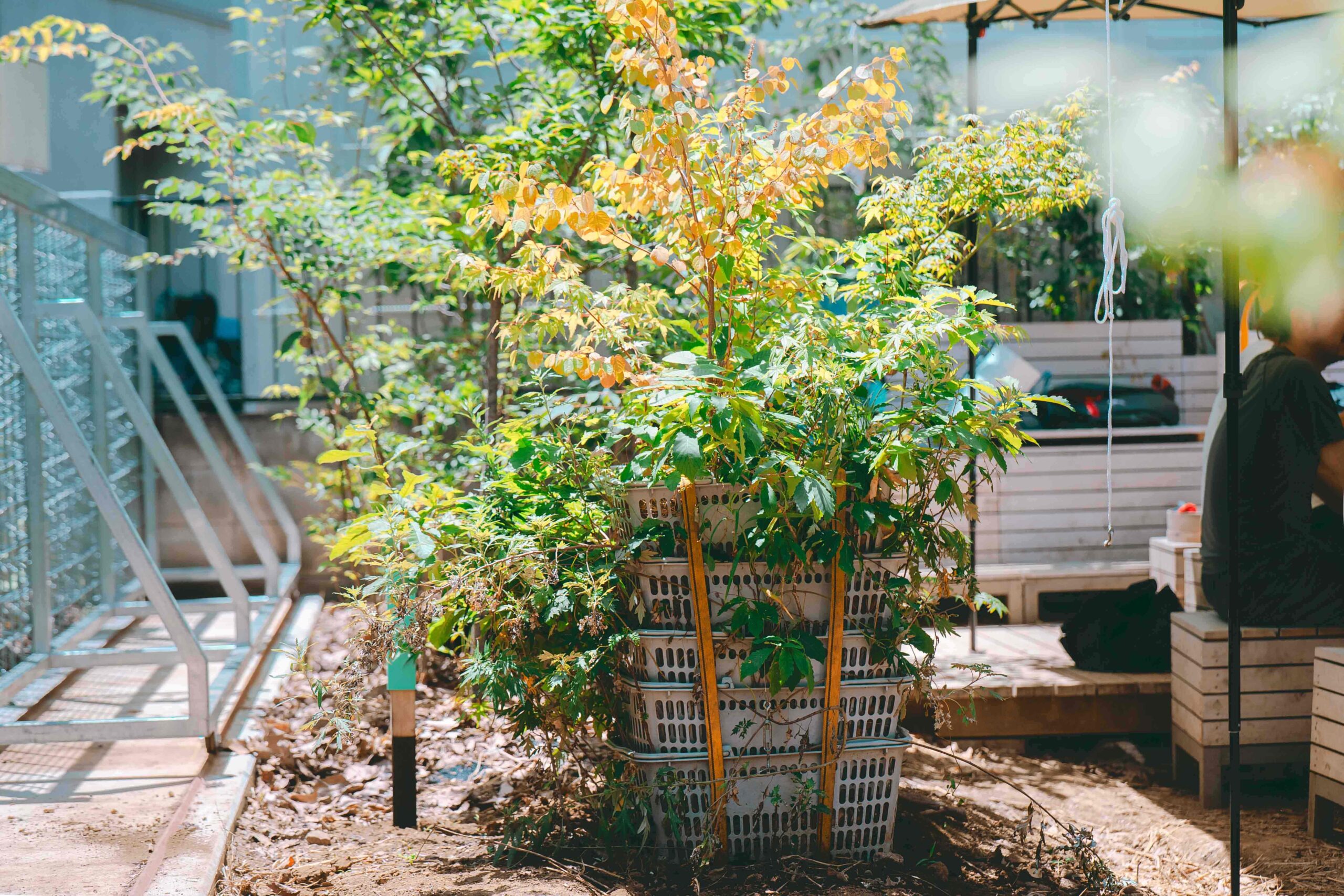 スーパーの買い物かごの形状と構造が、土中の水と空気の流れと同じ環境をつくり出すのにぴったりだという気づきから生まれたこのプランター。やってみると、菌糸と植物がすくすく育ったそうです。また、重ねることで落ち葉が圧縮され、堆肥化のスピードも早くなるのだとか。今は地植えする前の苗床として使っているそうです。