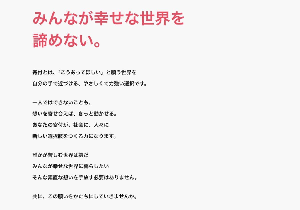 ボーダレスファウンデーションのサイト「DONATE 寄付で応援する」のページでも、「寄付は社会をつくる行動である」という考えが、より寄付者の視点に立った親しみやすい表現で示されている