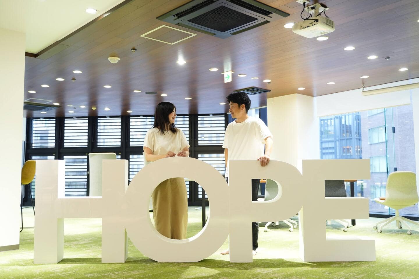 ボーダレス・ジャパンは、2023年から「SWITCH to HOPE 社会の課題を、みんなの希望へ変えていく。」という新パーパスを掲げ、共通のゴールを「社会課題解決」ではなく「希望づくり」に置く社会づくりに取り組んでいる。本社オフィスでは「HOPE」のモニュメントが来訪者を迎える