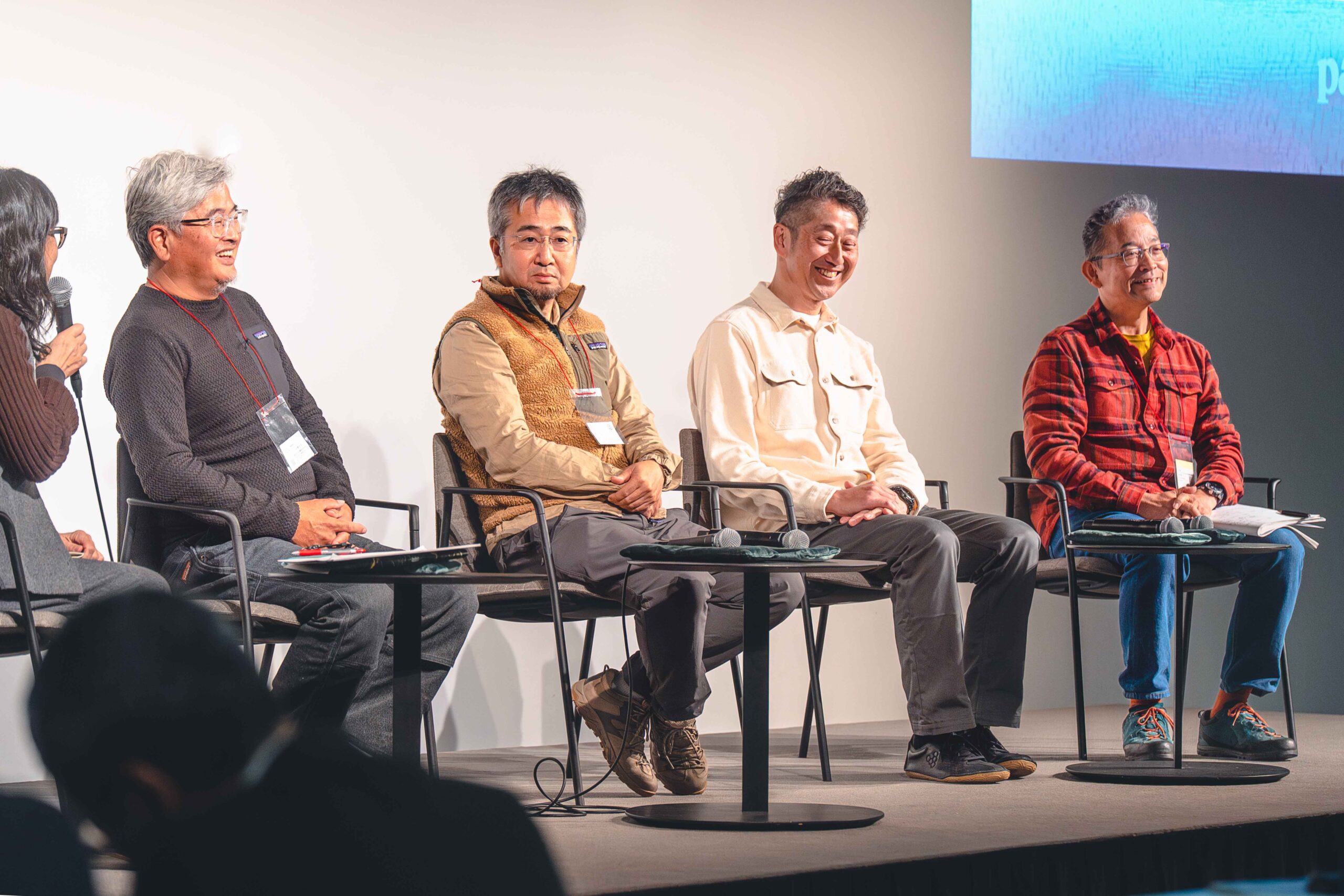 君島さん(写真左)をモデレーターに、平峰さん(左から2人目)、佐川さん(中央)、仁井田さん(右から2人目)、金子さん(右)でのディスカッション。生産者である平峰さん・仁井田さんからは、例年増加する気候危機の実感や、水田が水田であることの重要性などが語られた