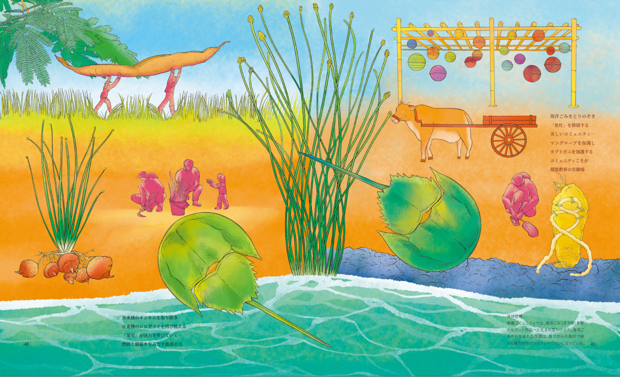 彩りゆたかで、繊細なイラストの数々。この絵本のページをめくって眺めているだけでも、里山や里海の美しい景色が目の前に広がり、そこで生きる人たちの息づかいが聞こえてくるような気がします。ぜひ、実際に手に取って台湾の風景を感じてみてもらいたいと思います。