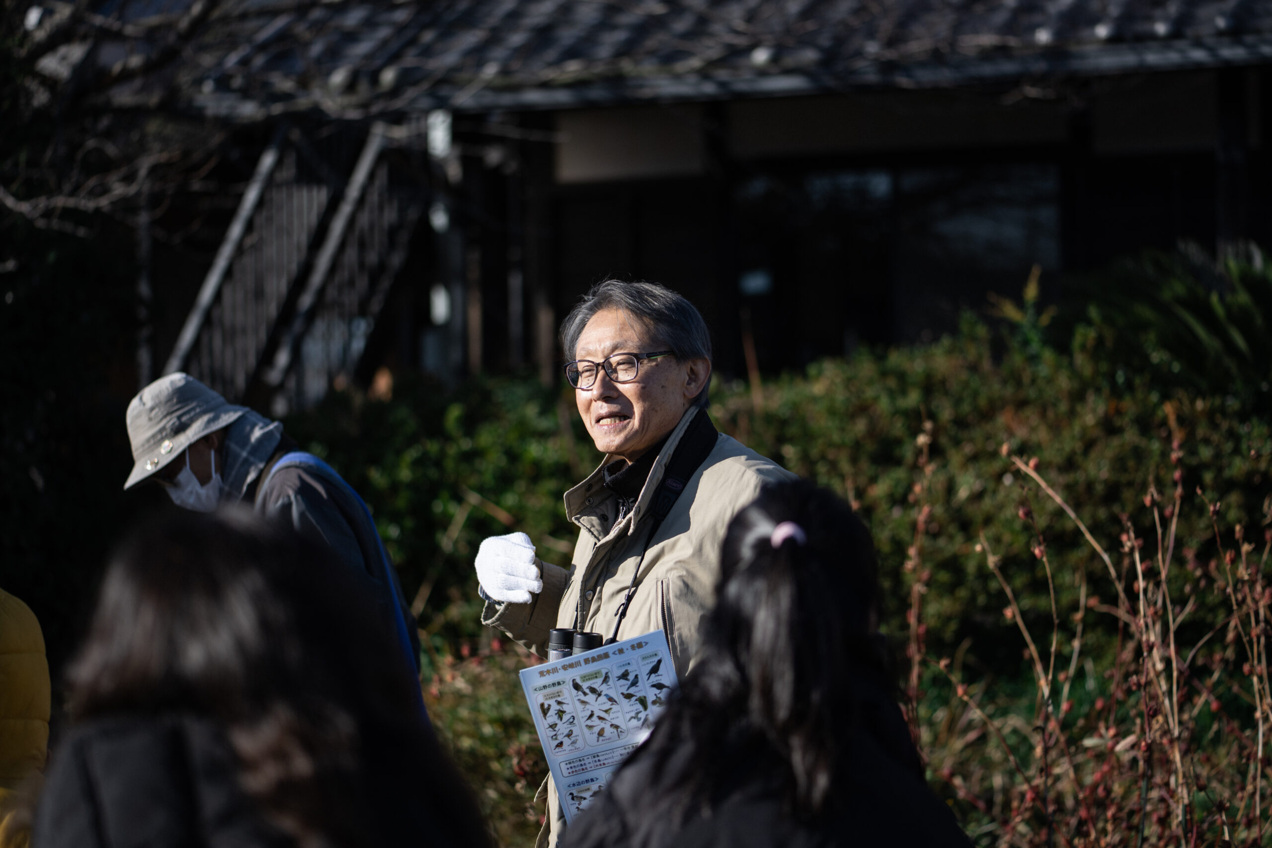体験先のコーディネートや野鳥観察の先生として活動をサポートする杉浦先生。野鳥観察と畑は、川の河口と源流の関係にあり、源流付近の耕作放棄地を自然に負荷がない方法で活用する「三角ベース」の活動は、河口の環境保全にもつながっていることを、子どもたちに伝えていた