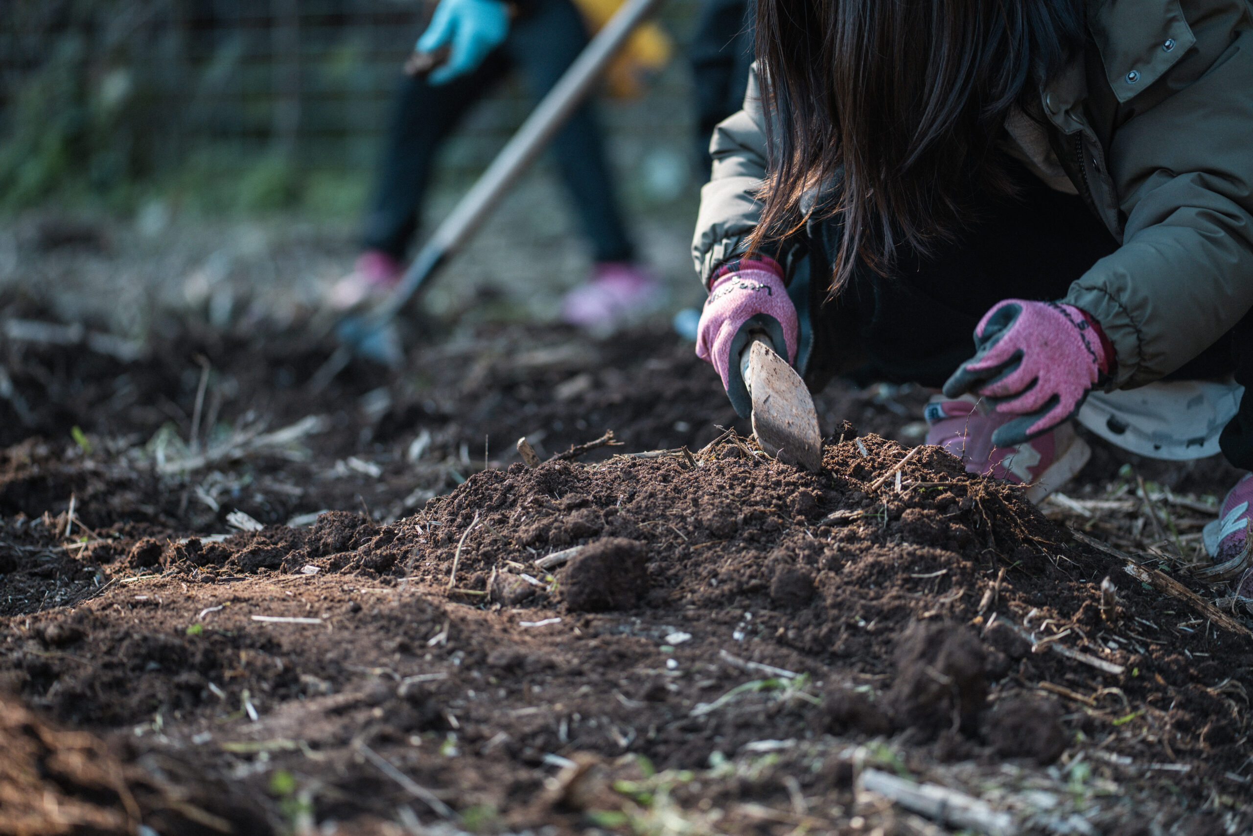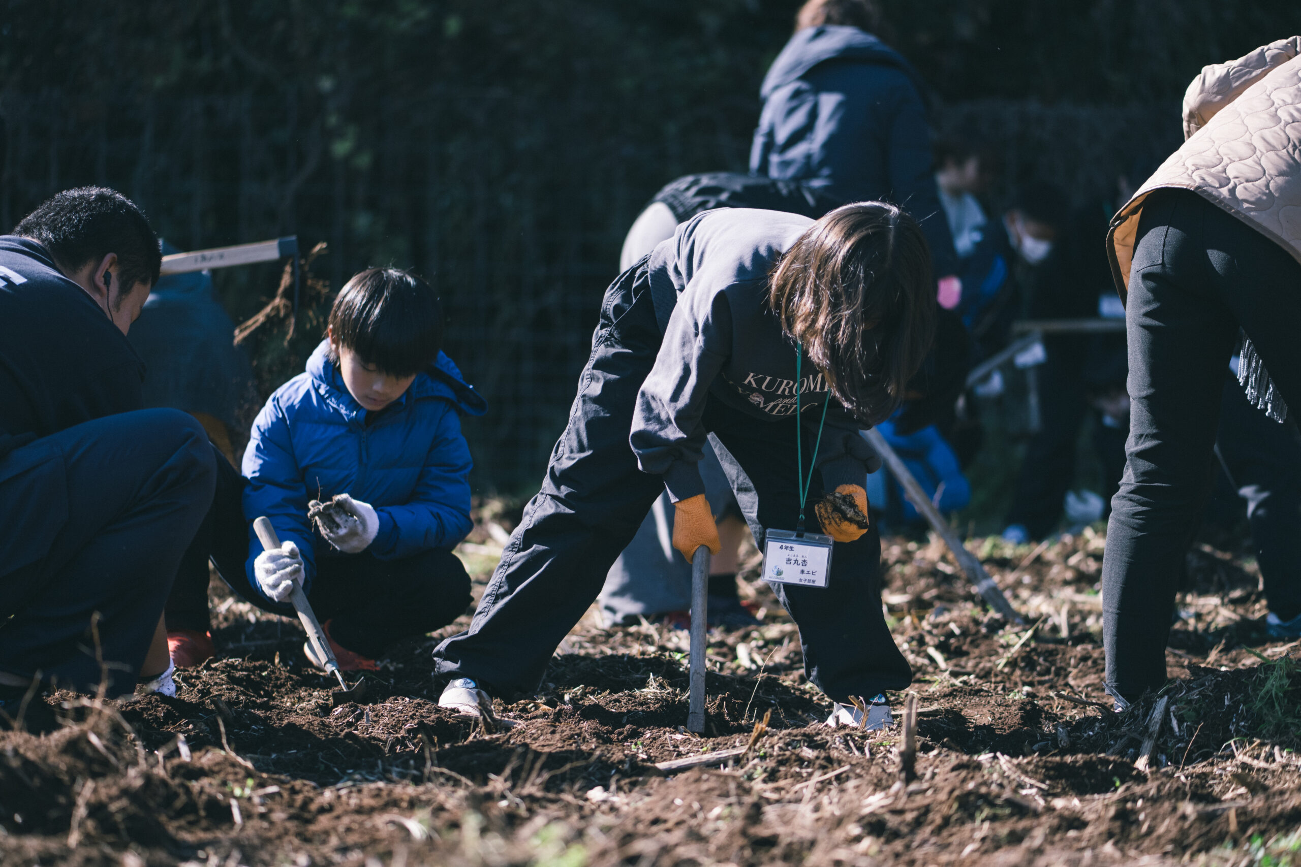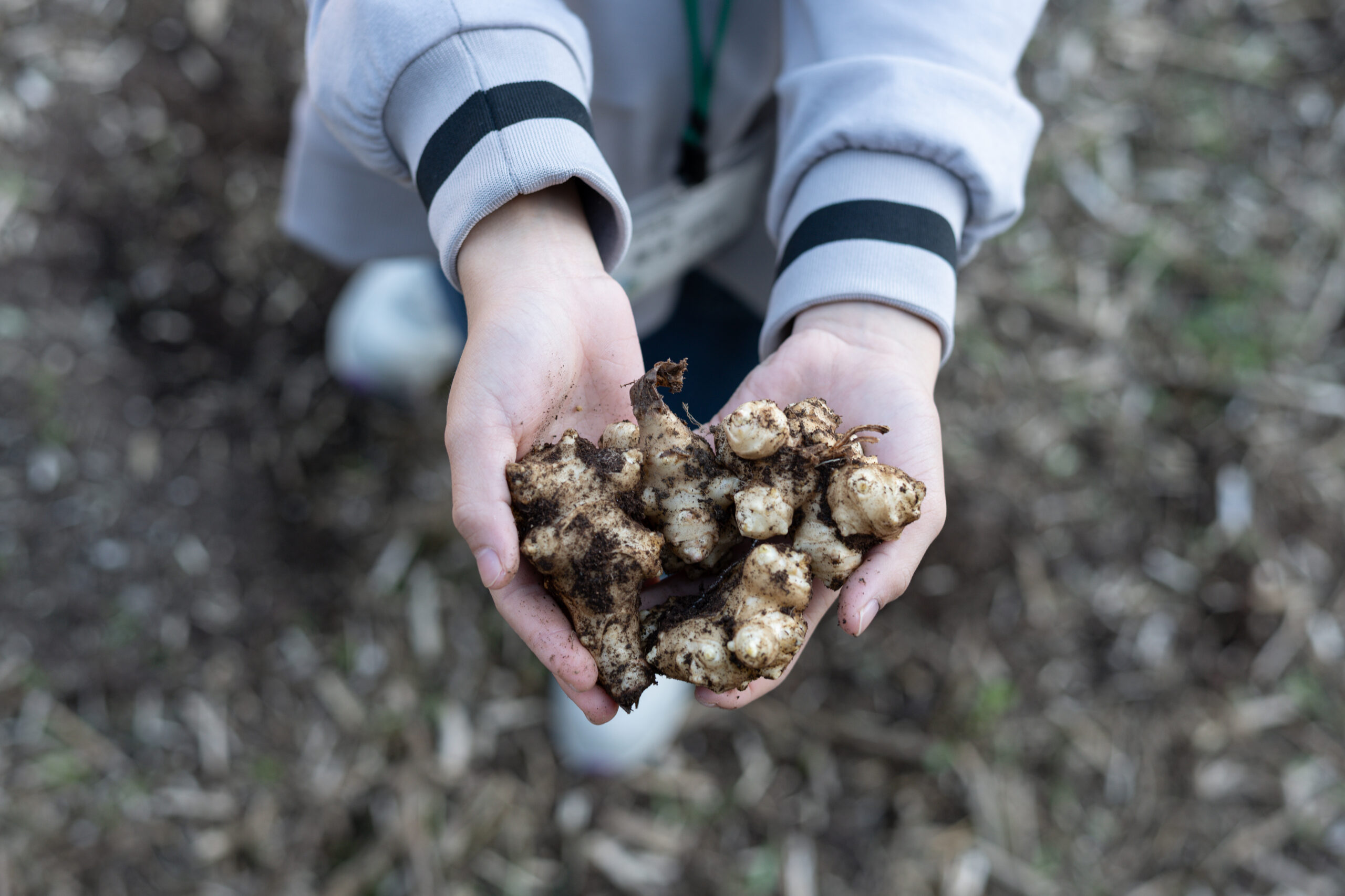 黒みがかった、ふわふわとした畑の土は、一見何も埋まっていなさそう。でも、クワやスコップで少し掘ると、たくさん菊芋が出てくること!最初は遠慮気味だった子も、夢中で土を堀っては、見つけた芋をコンテナに集めます。