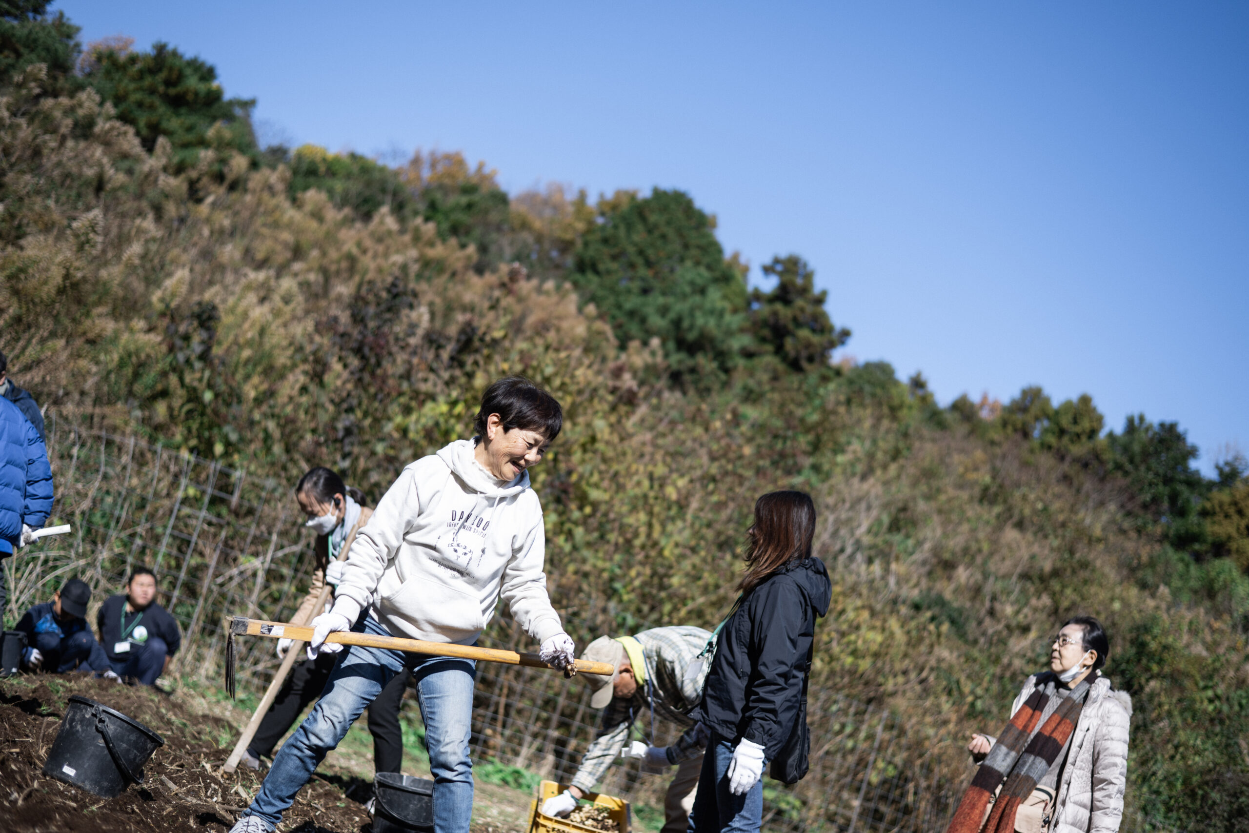つぎの目的地までは車で30分ほど。川の源流近くの地域にある障がい者サポートセンター「三角ベースやまのいえ」に向かいます。「三角ベースやまのいえ」は、社会福祉法人共生荘が運営する、就労継続支援B型作業所と地域活動支援センターの拠点。耕作放棄地となった土地を活用して農場を運営し、トラクター型の大型機械、農薬や化学肥料をつかわない自然農法で作物を栽培・加工・販売しています。ここで子どもたちが体験するのは、「菊芋」の収穫です。