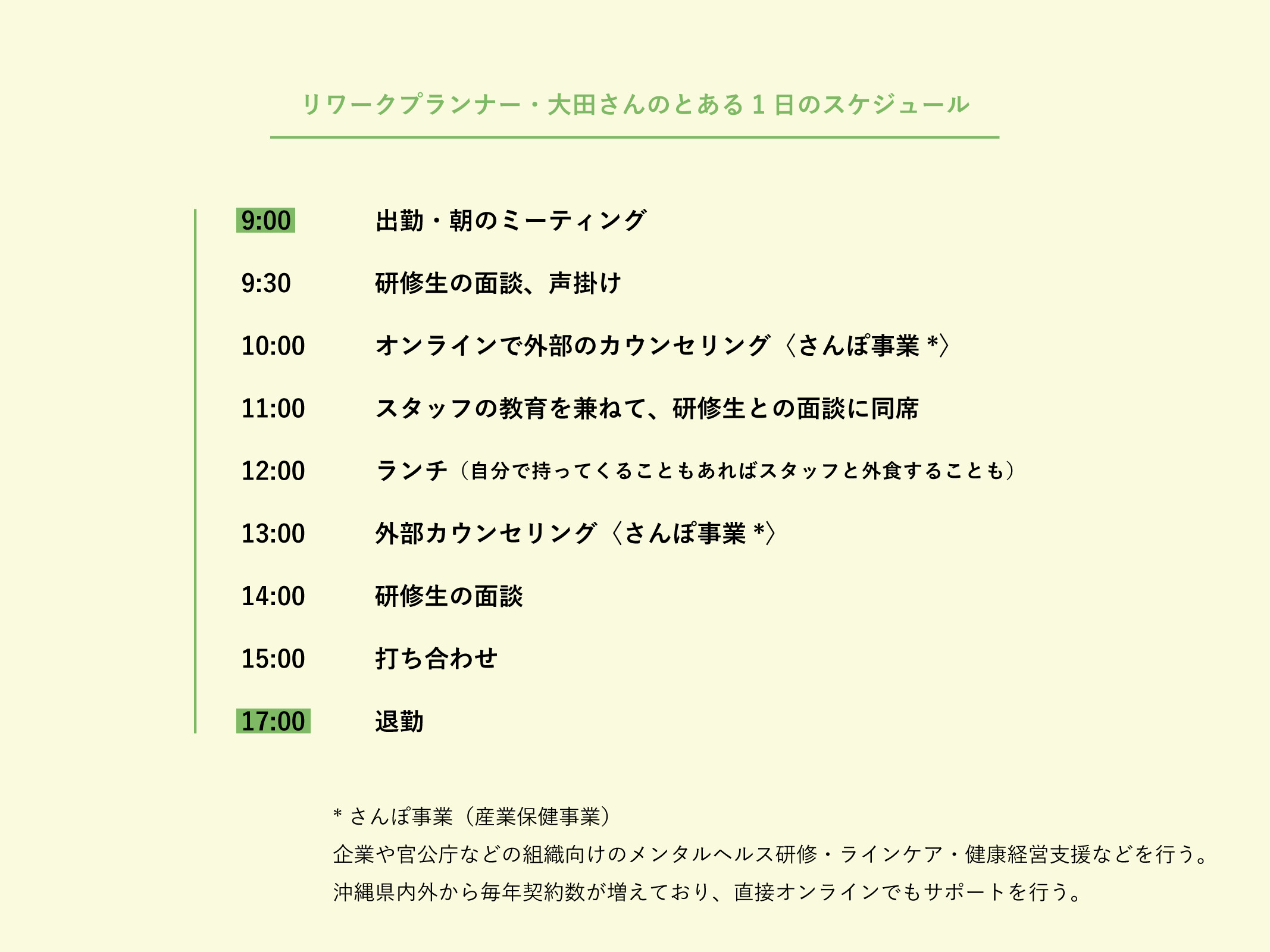 リワークプランナーのうち、大田さんや愛佳さんのように大学で心理学系を学び新卒で入社したメンバーはふたりを含めて4名、民間企業やフリーランスからの転職組が5名です。担当する仕事や日によってスケジュールは異なりますが、参考に大田さんのとある月曜日のスケジュールをお伺いしました。