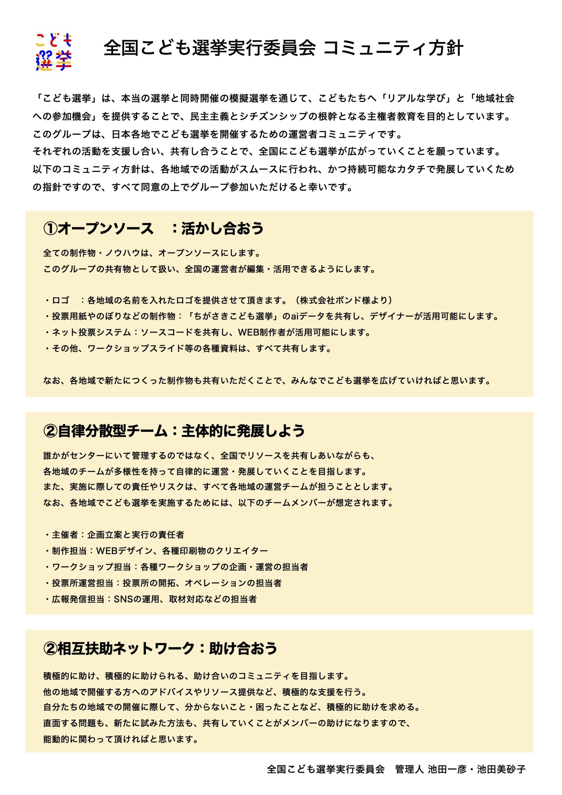 池田さん 広がっていくならルールで縛るのではなく共通して保持する文化のようなものが必要かなと思い、3つのコミュニティ方針をつくりました。一つはオープンソース。ちがさきこども選挙で培ったノウハウやロゴ、チラシデザインや企画書のひな形、投票システムまで、全部無償で提供することにしました。その代わり、みなさんが得たノウハウも共有してくださいねとお願いしました。二つめが自律分散型でやりましょうということ。全部に僕らが関わることは不可能なので、各地域で実行委員会をつくって、その責任のもとでやってもらうことにしました。