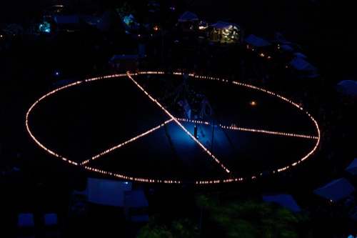 夕暮れからキャンドルタイム。会場に直径34mのピースマークの形が現れてきます。
