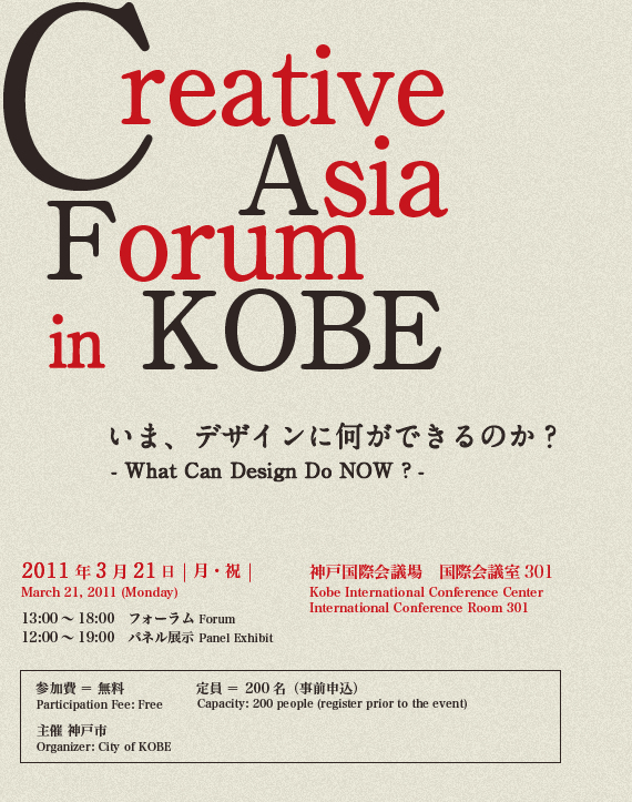 3月21日(月曜・祝日)に神戸国際会議場にて予定しておりました「クリエイティブアジアフォーラム in KOBE」につきましては、このたびの東北地方太平洋沖地震による甚大な被害の状況を鑑みて、中止とさせていただきます。 また、当日に予定されておりました交流会も併せて中止にさせていただきます。
