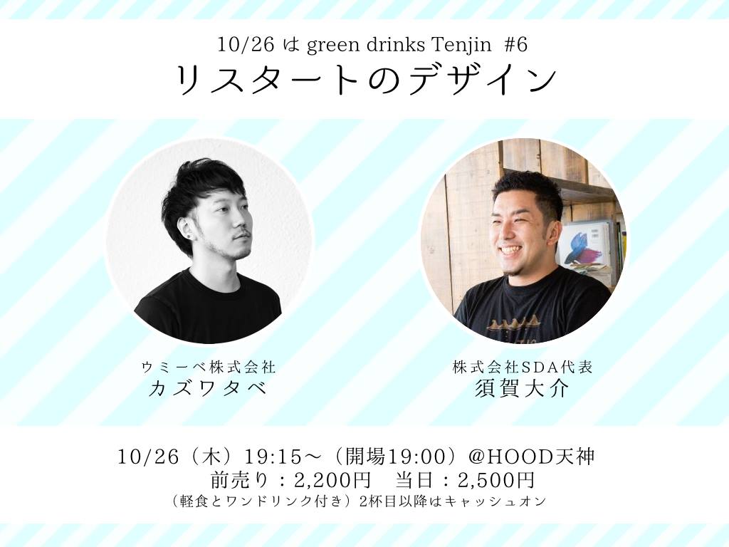 「ソーシャルデザイン」をテーマにおいしい食事とお酒でゆるく繋がるイベント green drinks Tenjin (略してgdT!) 。次回は第6回目を迎えます!